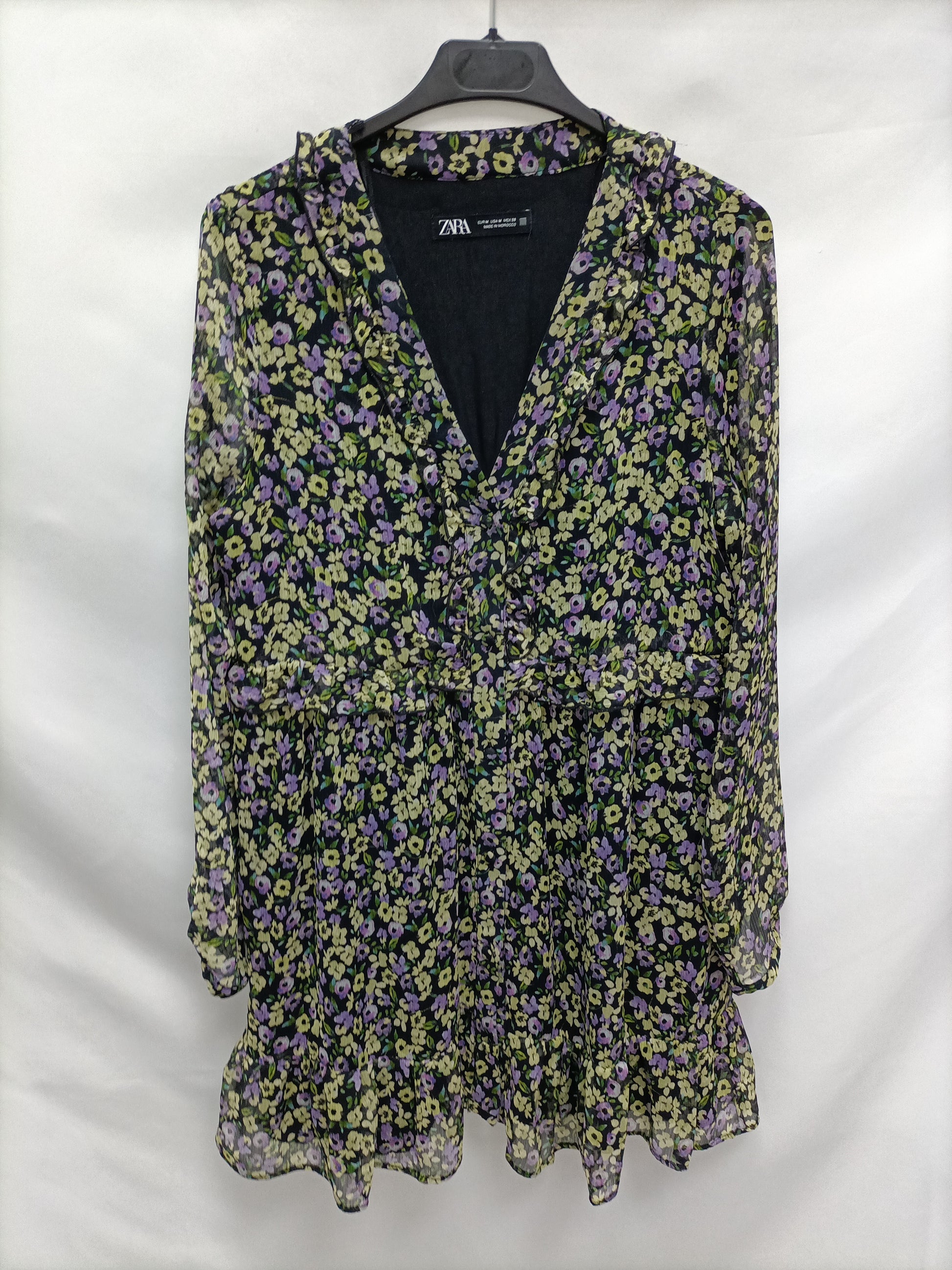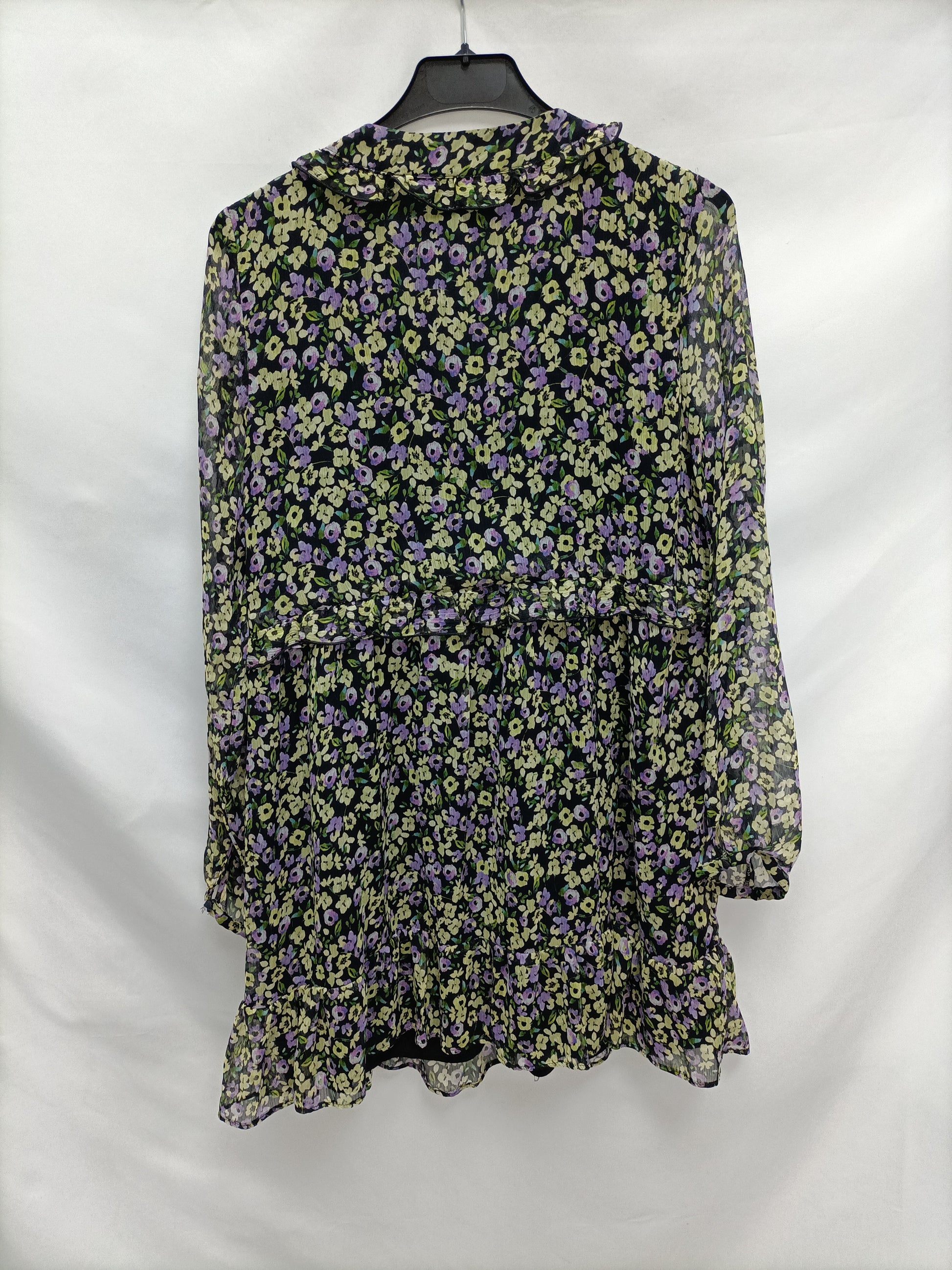 Vestido corto negro con flores amarillas y morada con volantes. Abotonado.m No elástico. De sisa a sisa 45 cm largo 79 cm.