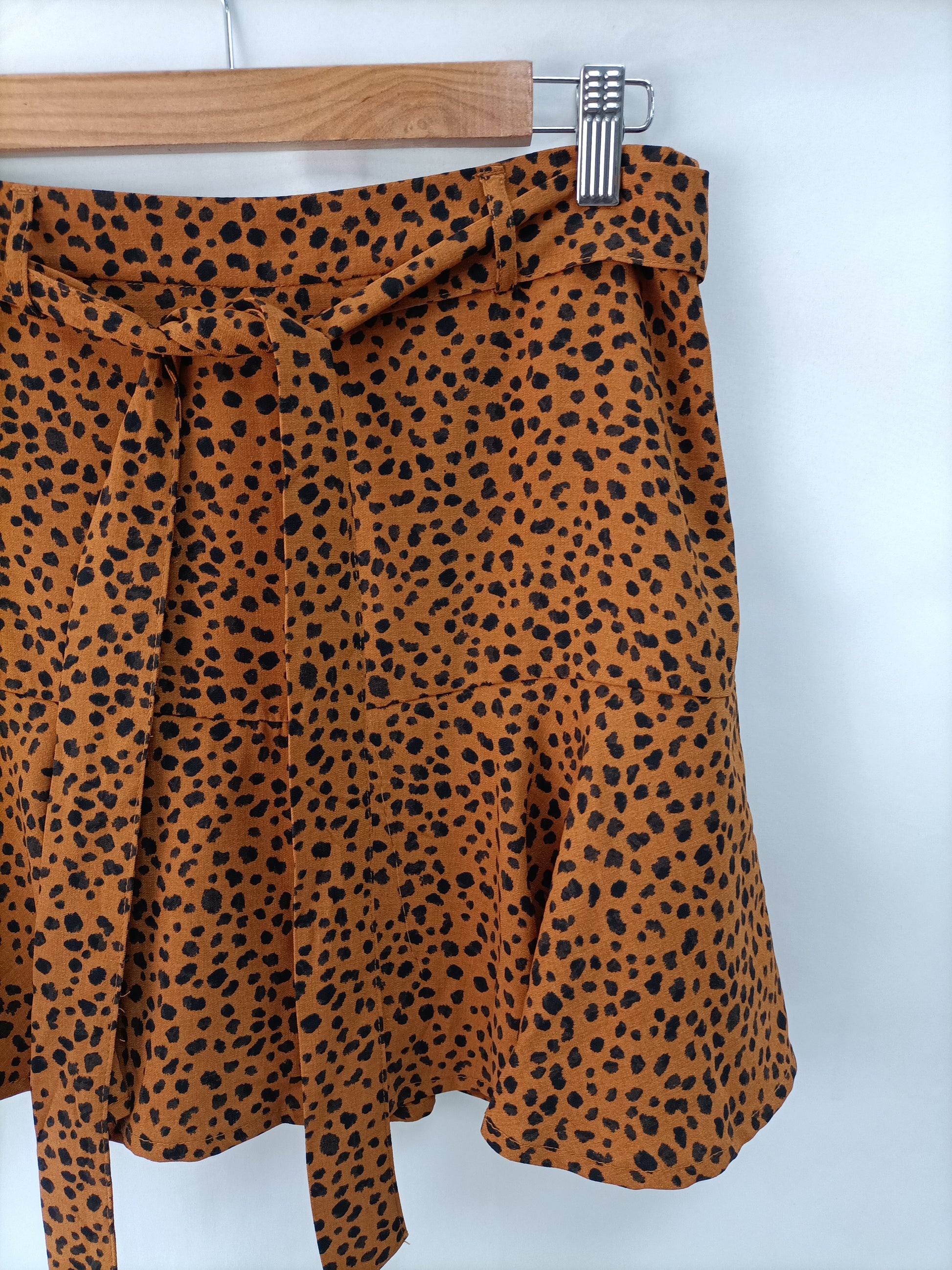 Falda pantalón color teja con estampado.print en negro. No elastica. Cintura 38 cm largo 41 cm