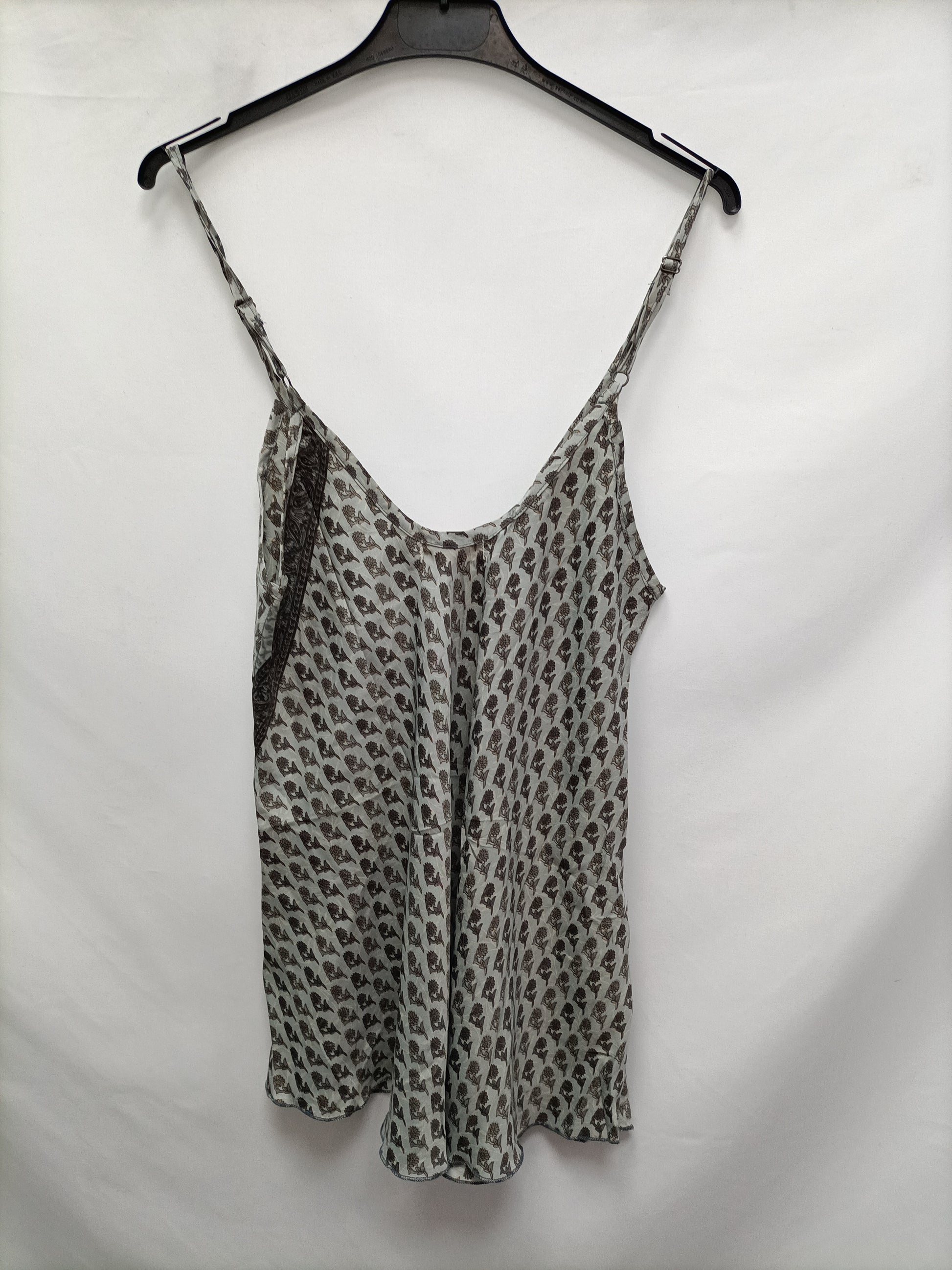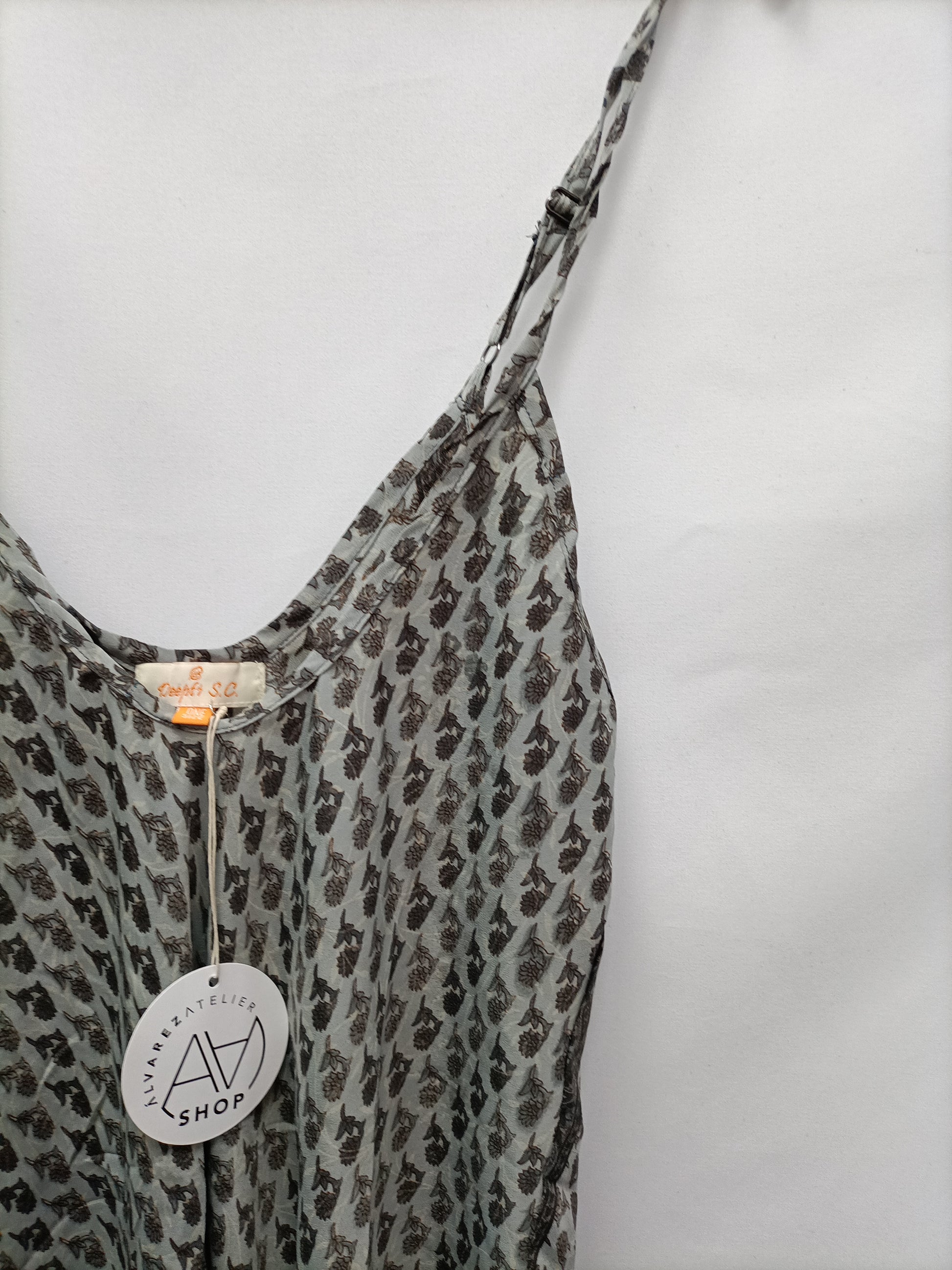 NUEVO CON ETIQUETA. Top fluido en tono gris azulado con flroecitas. No elástico. Con tirantes ajustables. De sisa a sisa 46 cm Largo 72 cm