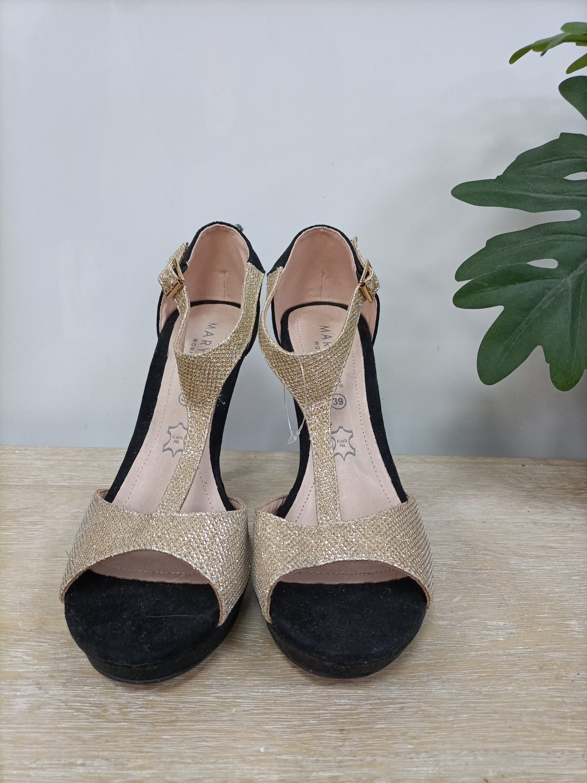 Sandalia dorada y negra con detalle de purpurina. Tacón 12 cm plataforma 2 cm