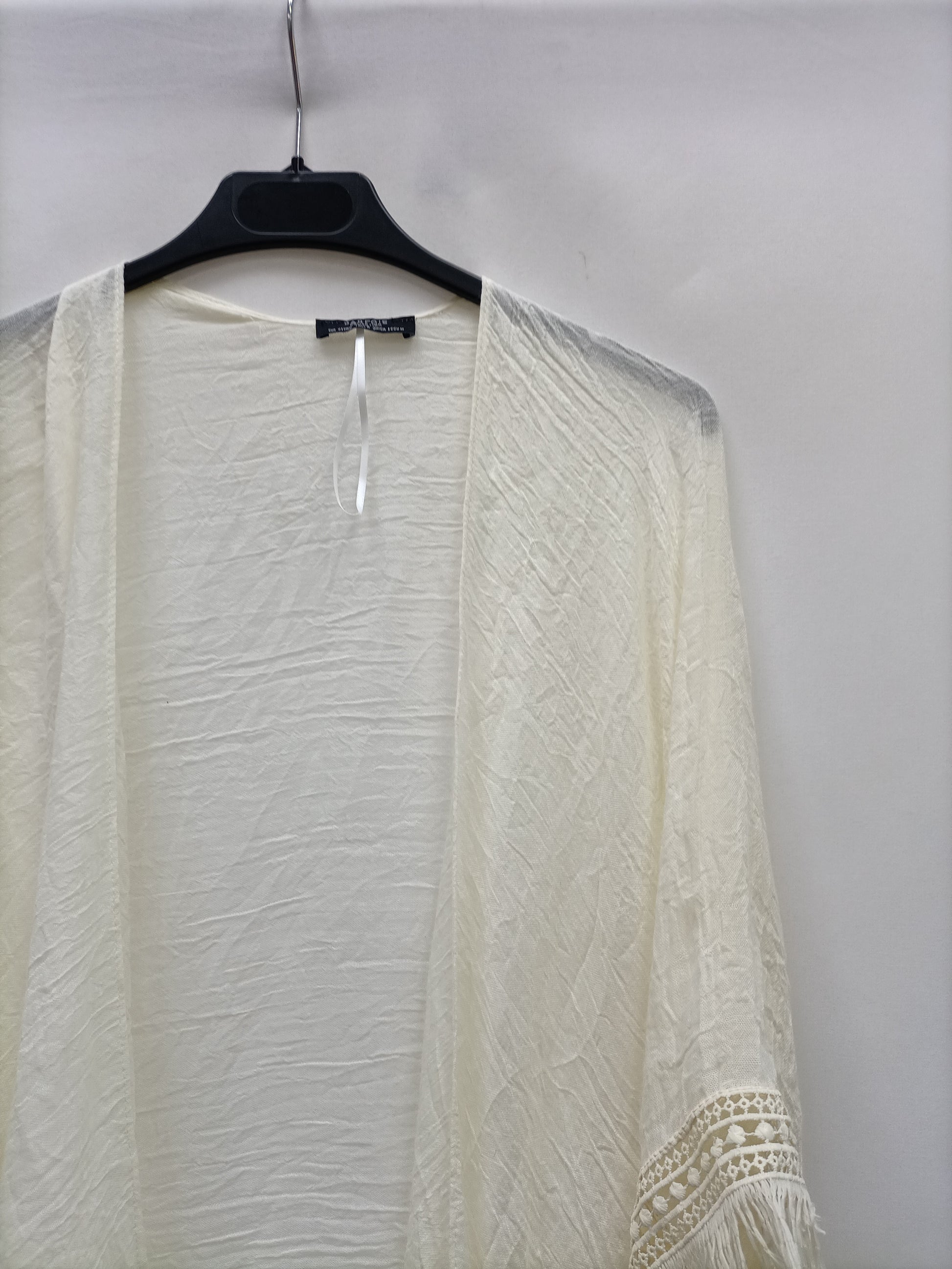 Kimono color beige, abierto con detalle de flecos.largo 73cm
