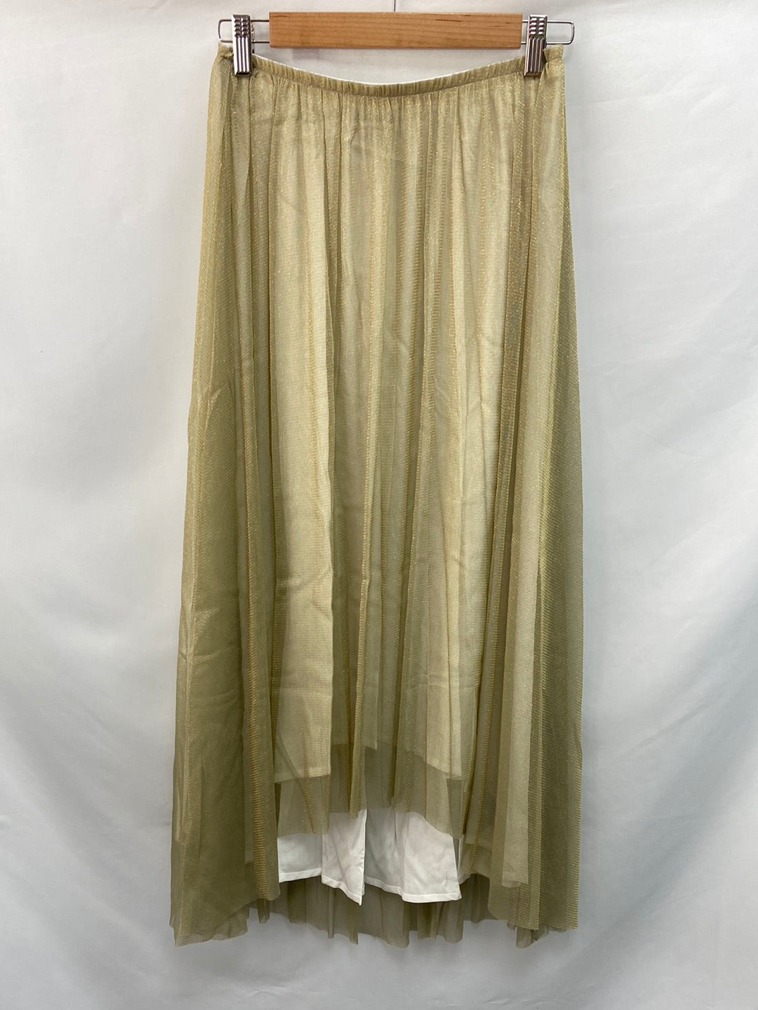 NUEVO CON ETIQUETA. Falda midi dorada de tull con el bajo asimétrico cintura elástica y fluida. Largo delantero 74 cm y trasero 95 cm