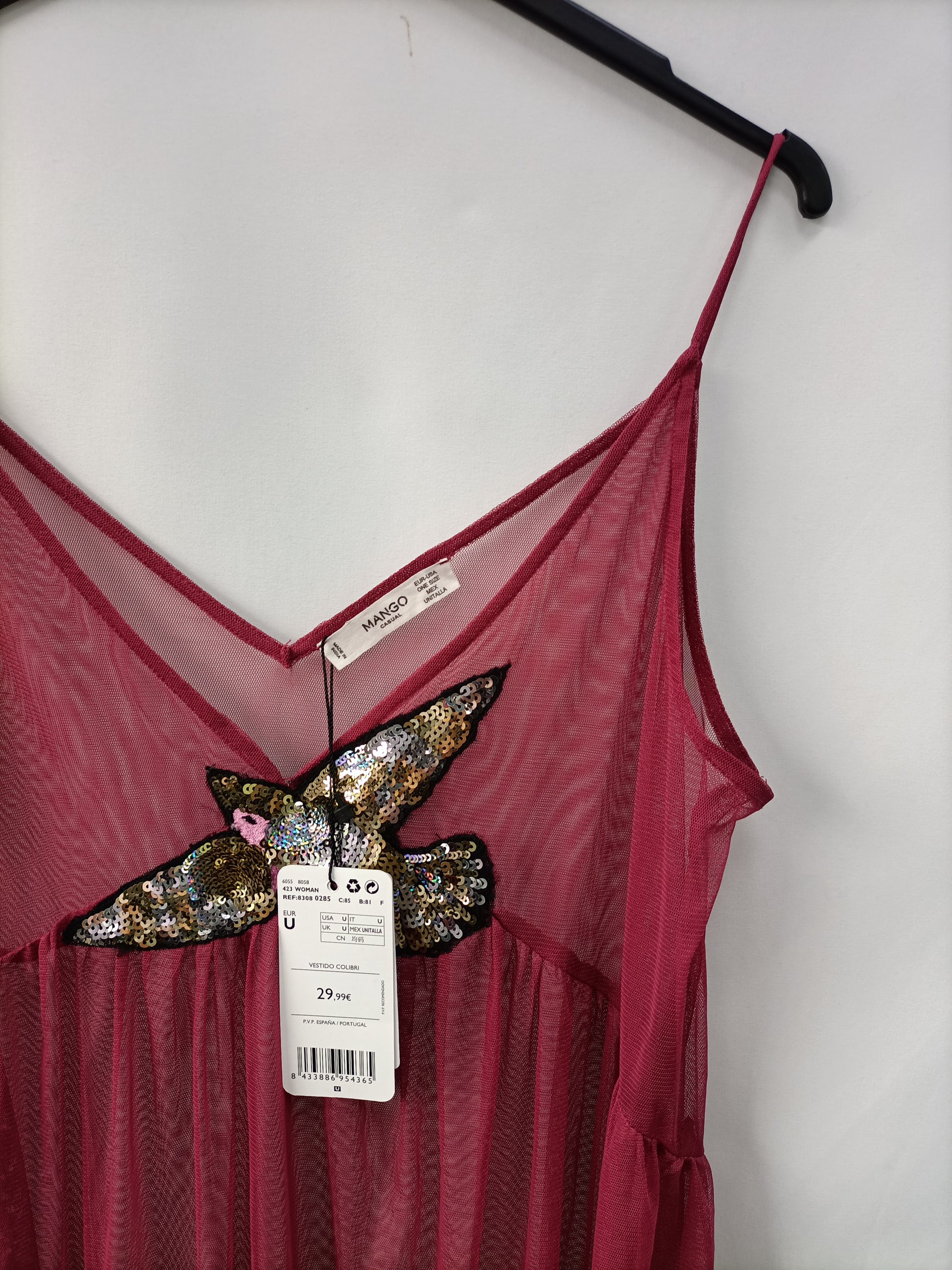 NUEVO CON ETIQUETA. Vestido largo rosa oscuro de tull con pájaro de lentejuelas. Largo 135 cm