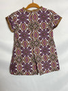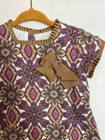 Vestido estampado morados con detalle de lazo. Abotonado a la espalda.