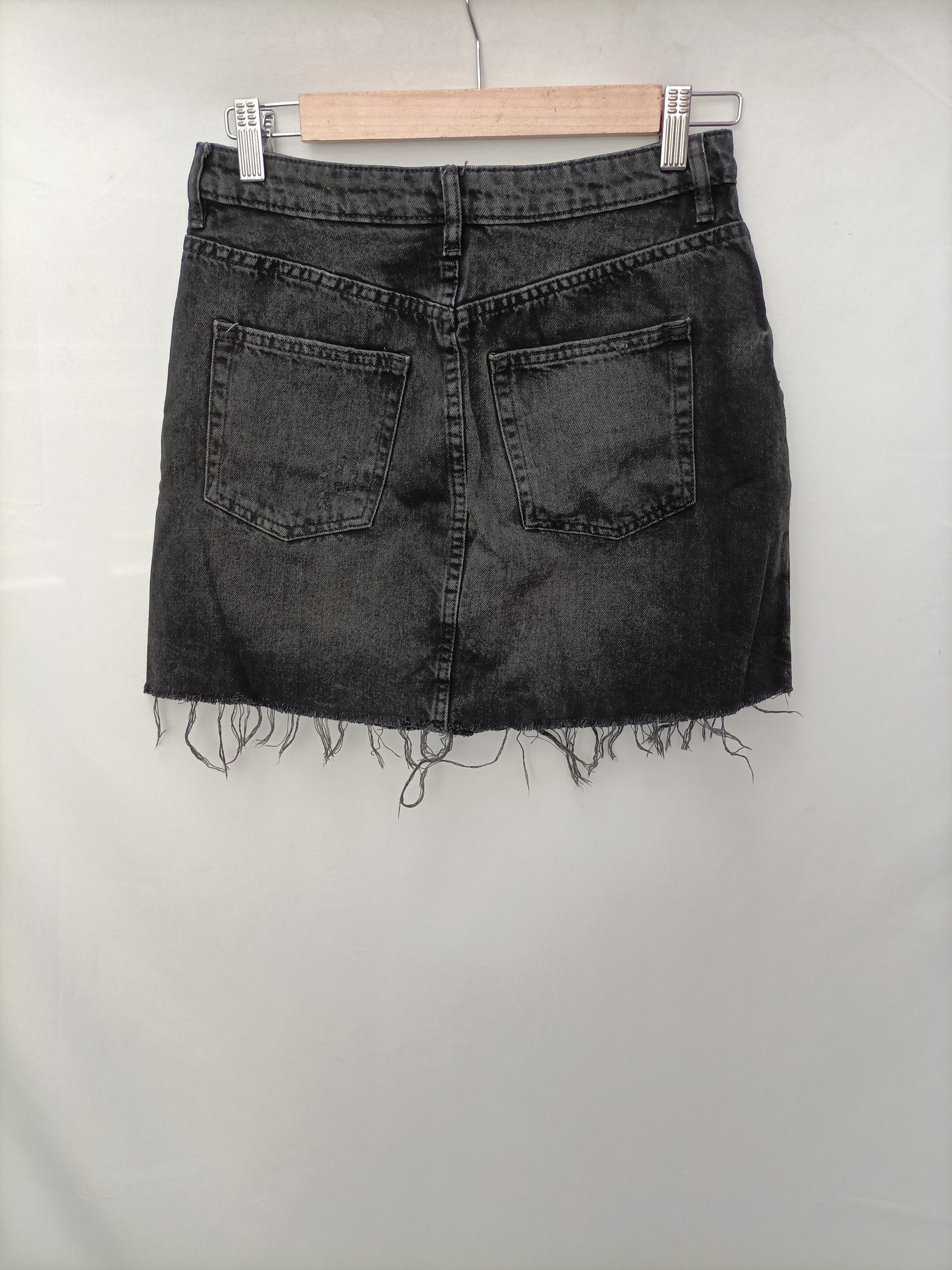 Falda negra corta tejido denim con la parte de abajo deshilachada. No elástica. Cintura 36 cm Largo 39 cm.