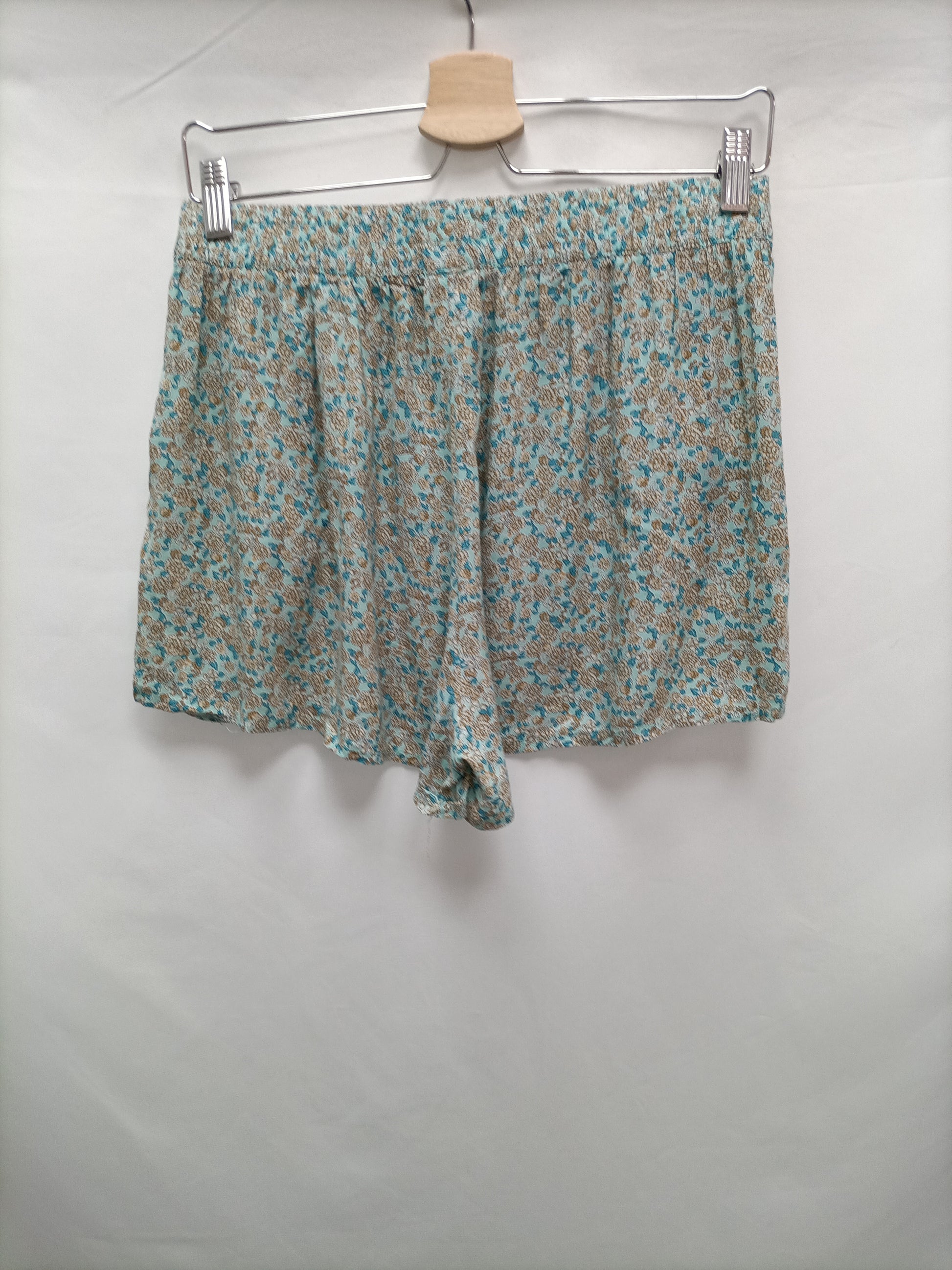 Shorts fluido azul con flores en tono beige. Cintura elástica. largo 34 cm