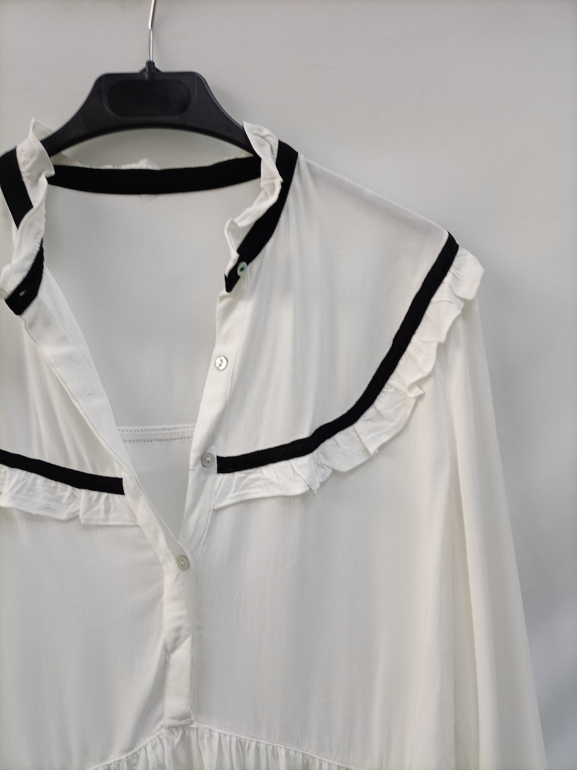 Blusa blanca con ribete negro y volantes. De sisa a sisa 51 cm largo 67 cm