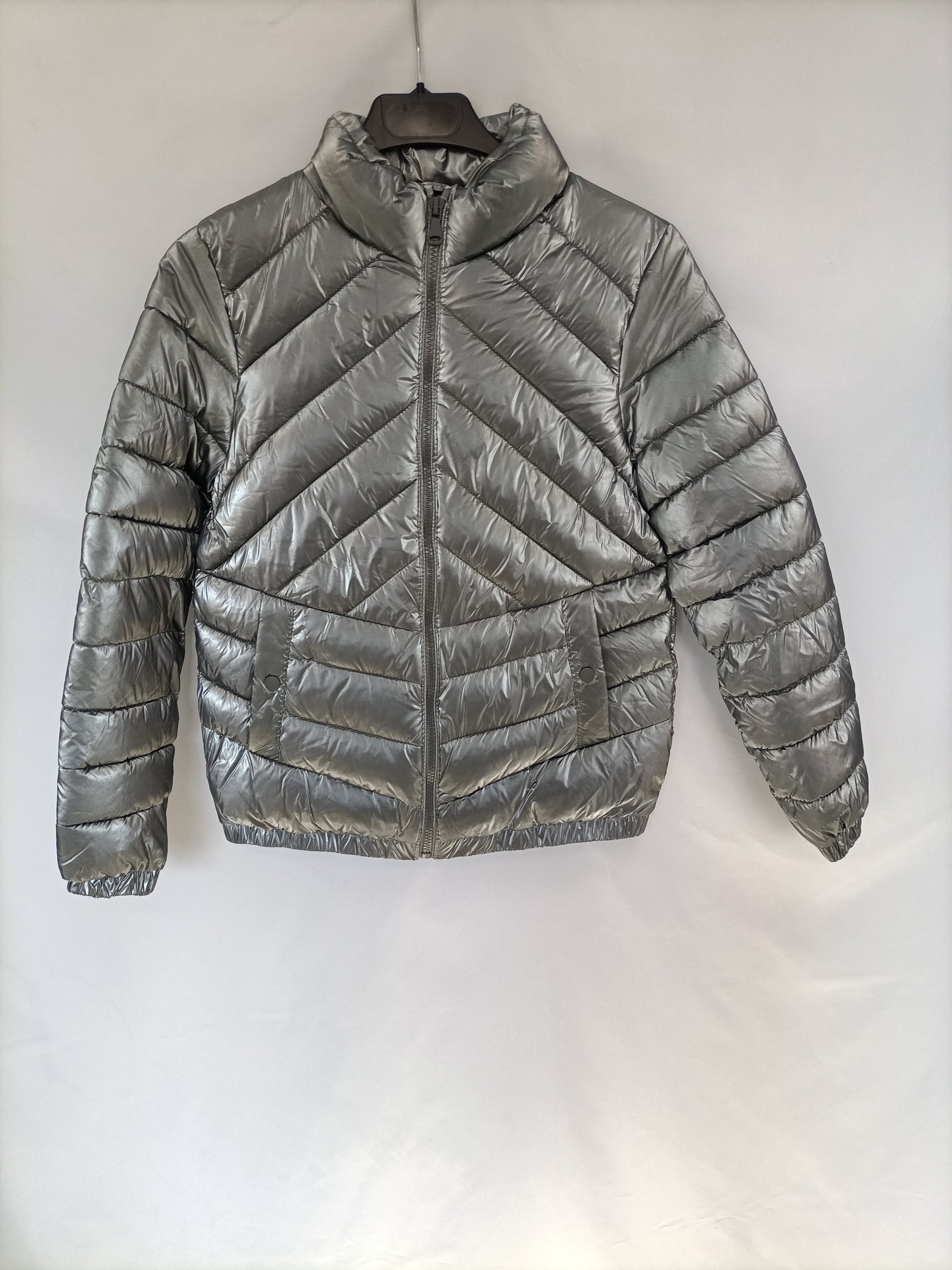 Plumas ligero plateado con cremallera. Cintura elástica. De sisa a sisa 43 cm largo 55 cm