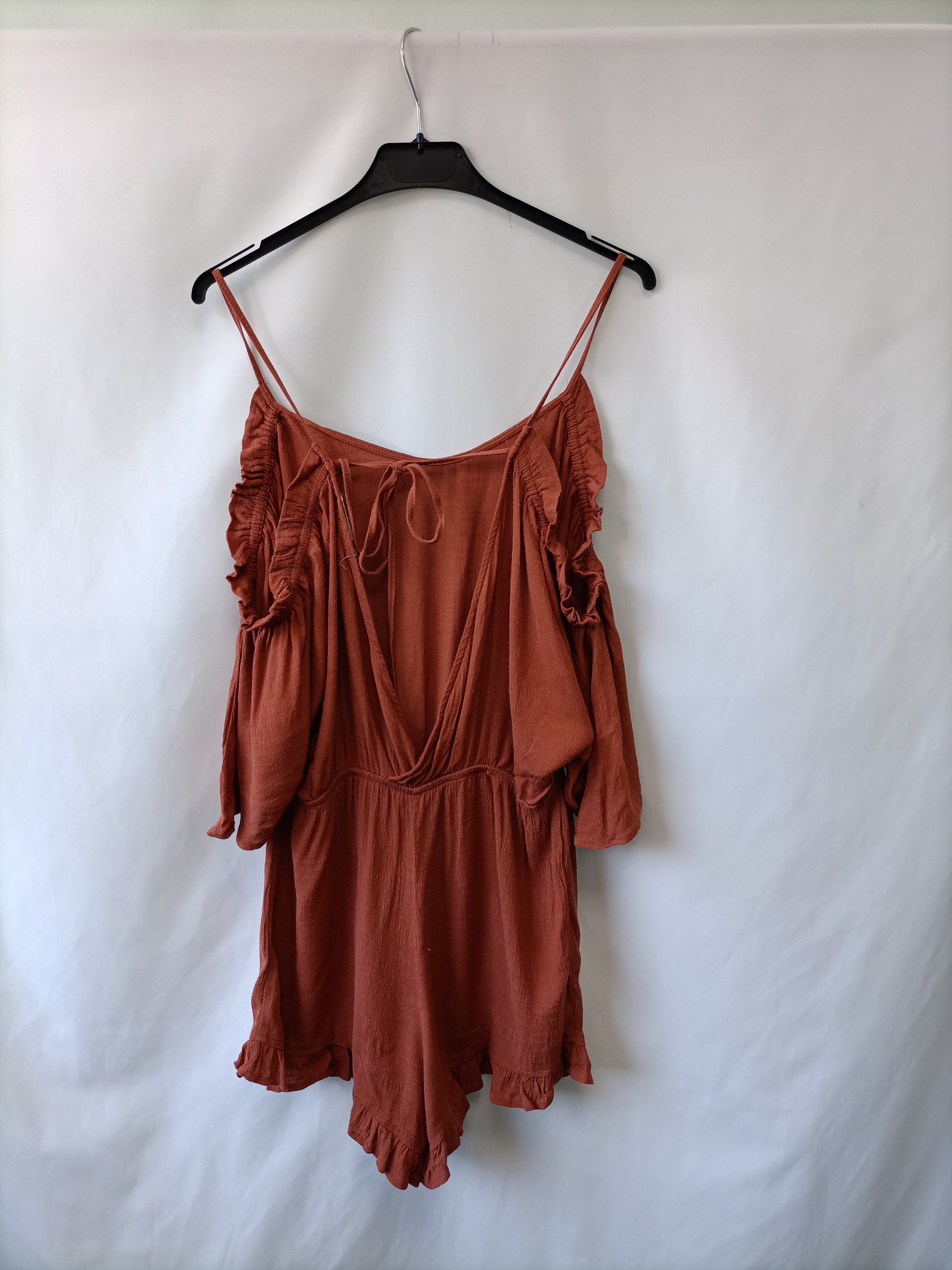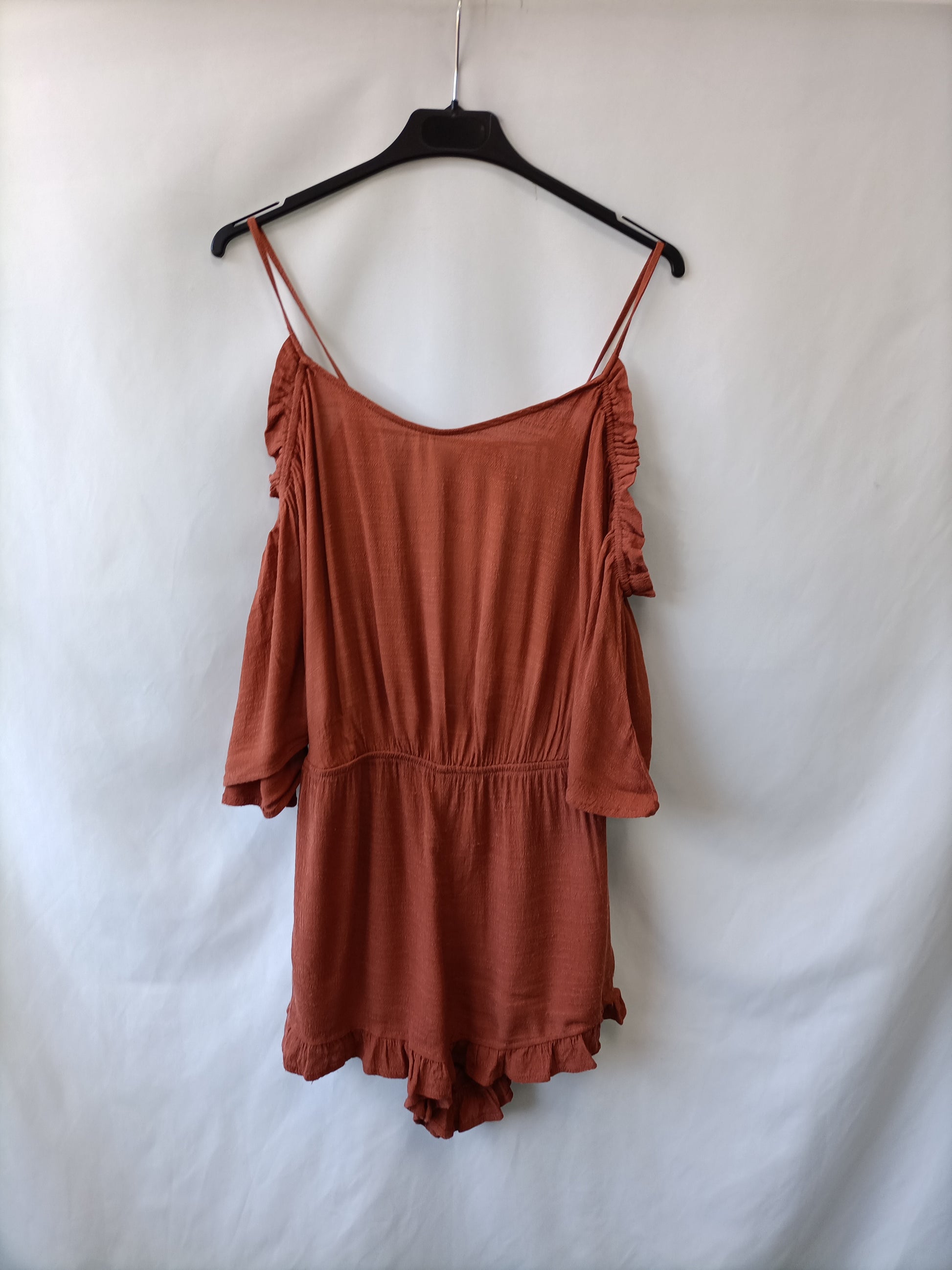 Mono fluido teja con tirantes y mangas con hombros al descubierto. Largo 77 cm