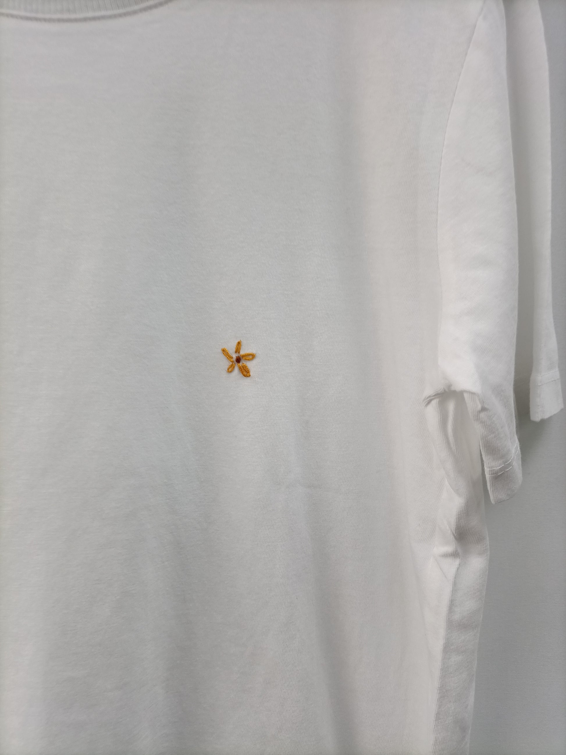 Camiseta blanca básica con margarita bordada. Largo 52 cm