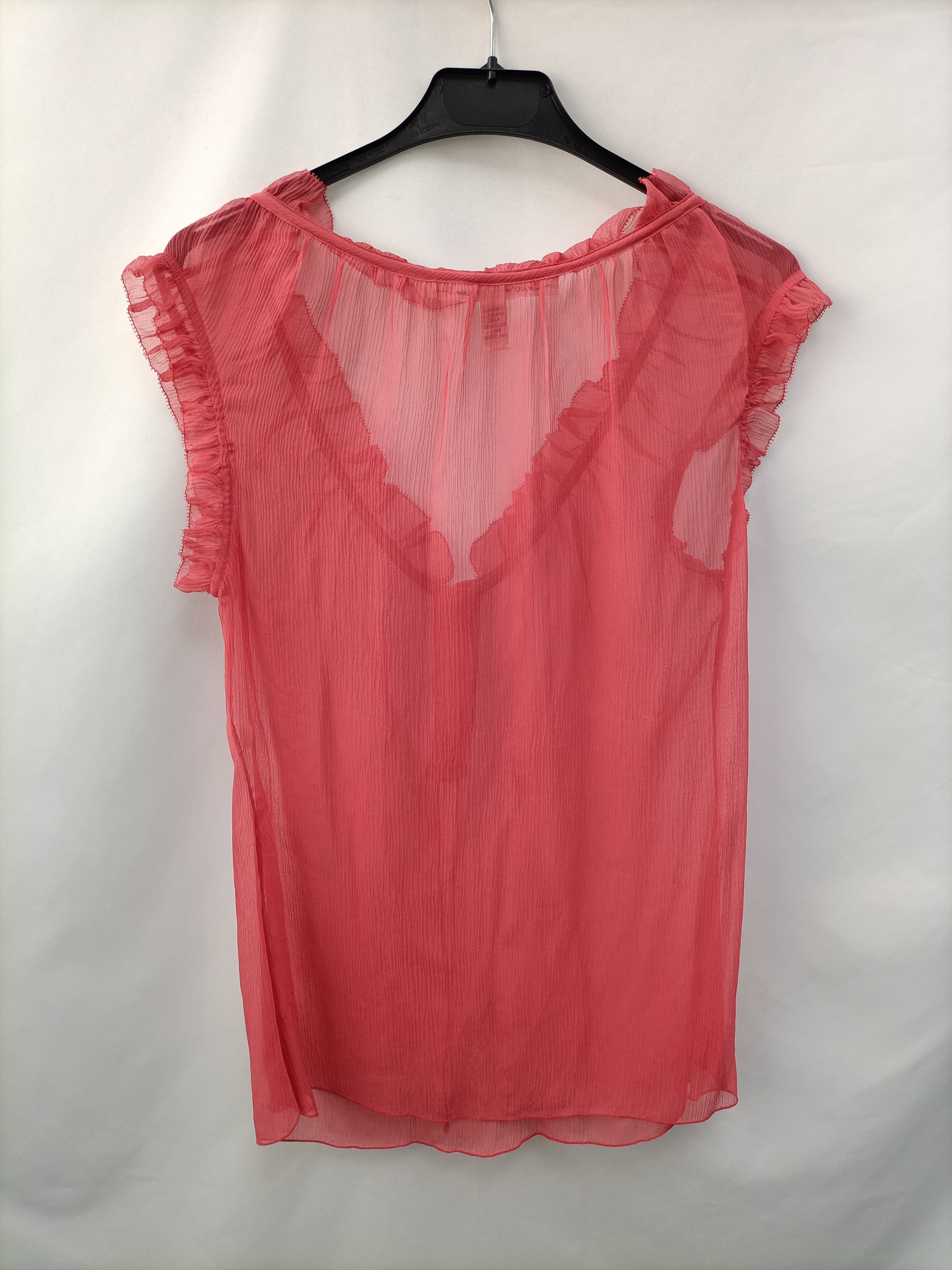 Blusa fluida de seda semitranparente con el cuello y mangas estilo volante. De sisa a sisa 53 cm Largo 63 cm
