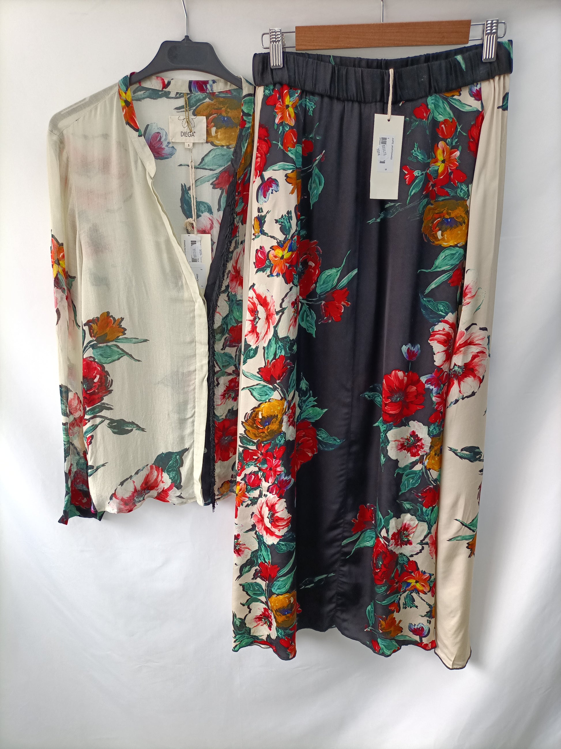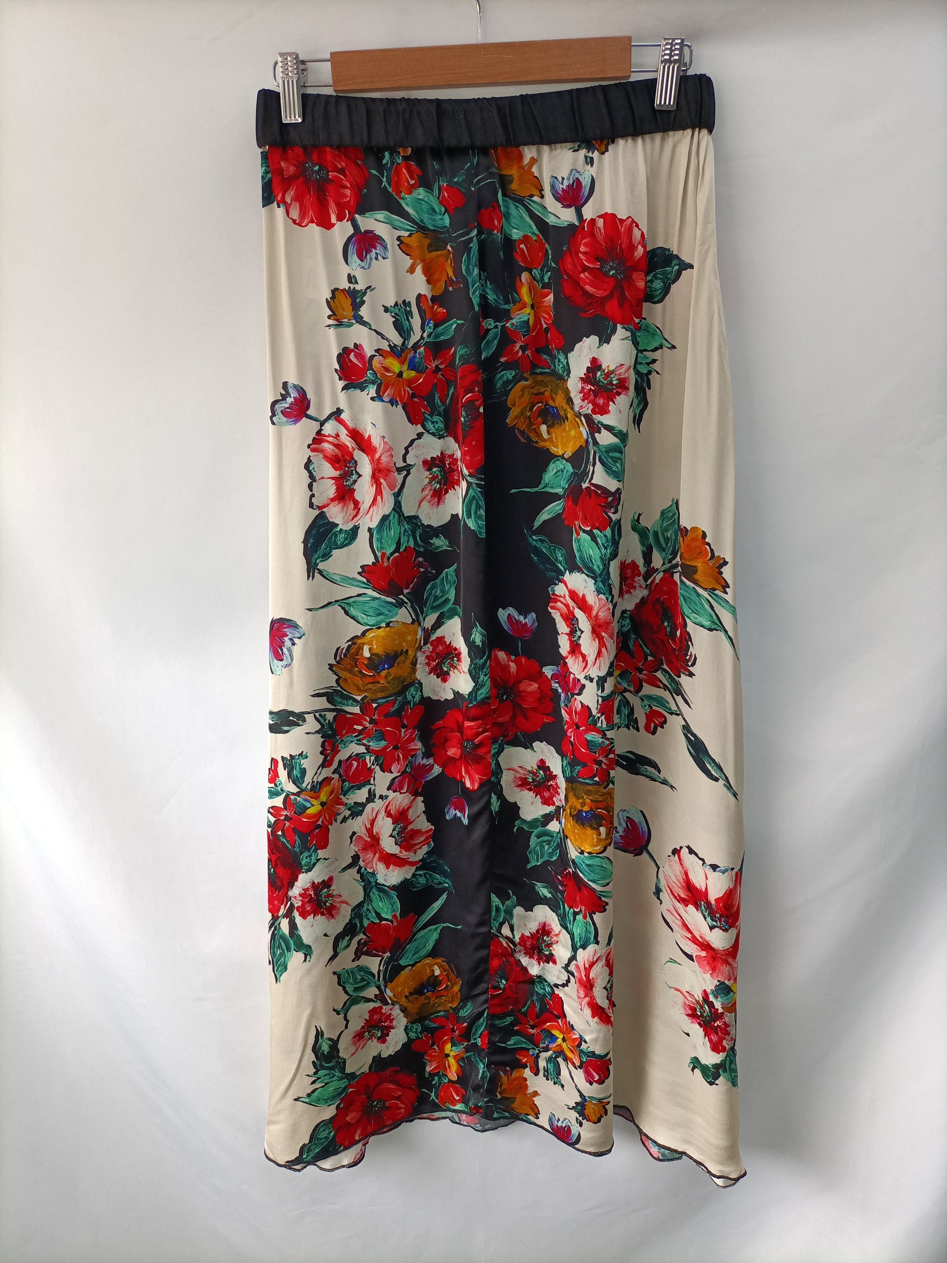 NUEVO CON ETIQUETA. Falda beige y negra con estampado de flores. Fluida con la cintura elástica. Largo 97 cm. Total look