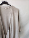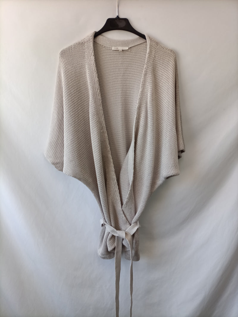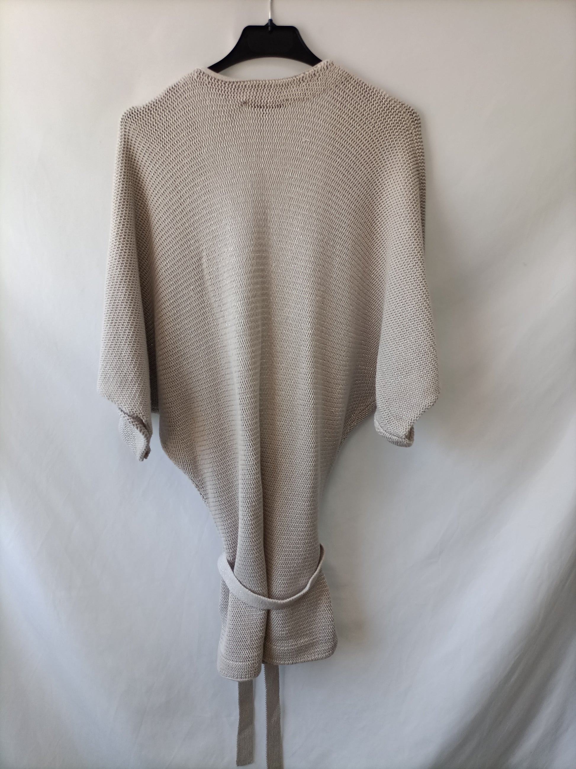 Cárdigan gris con detalle de hilos plateados. Mangas estilo murciélago. Elastico. Largo 85 cm.