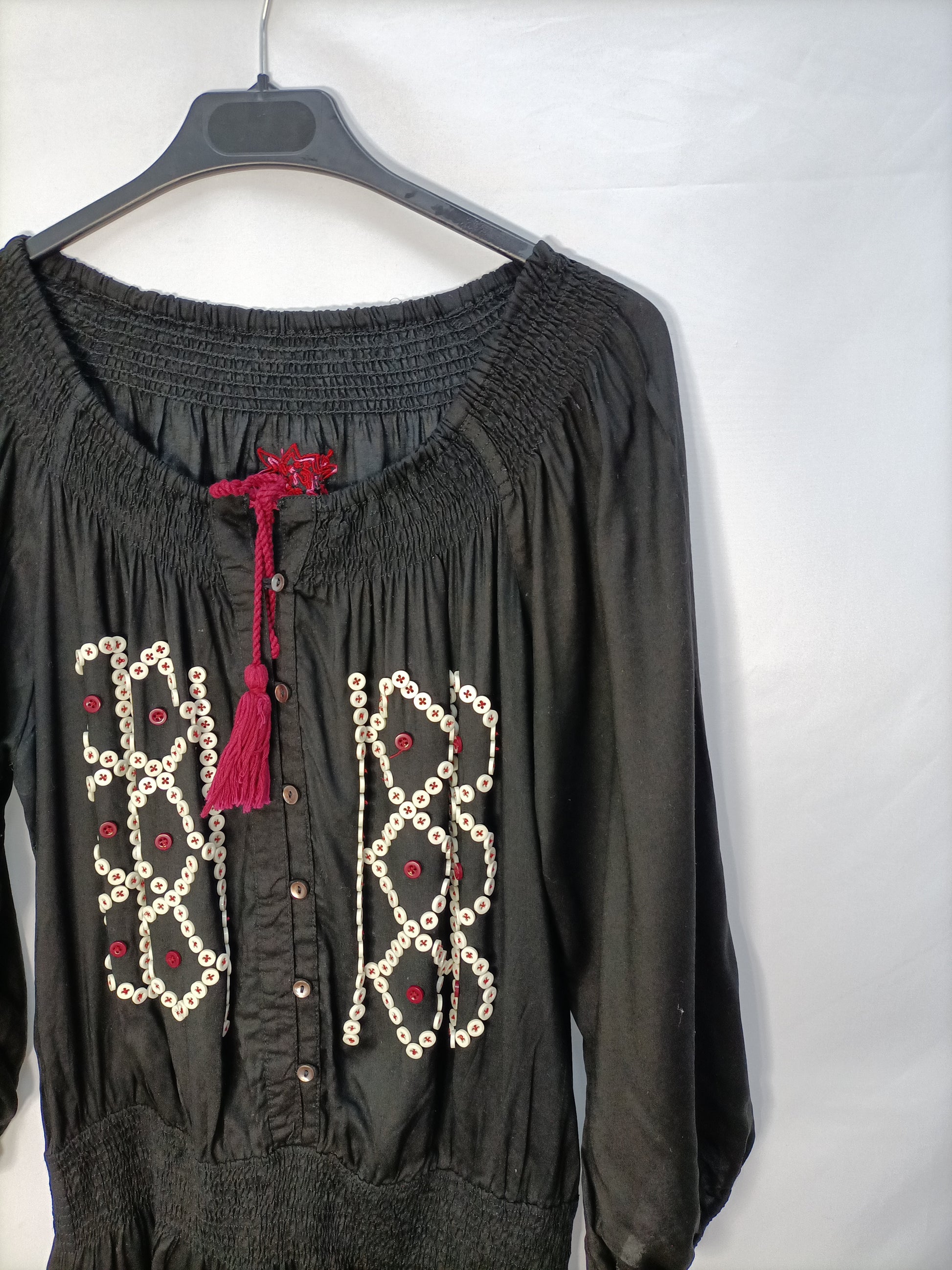 Vestido corto negro con detalle de abalorios. Cuello amplio elástico de nido de abeja igual que la cintura. De sisa a sisa 58 largo 95 cm