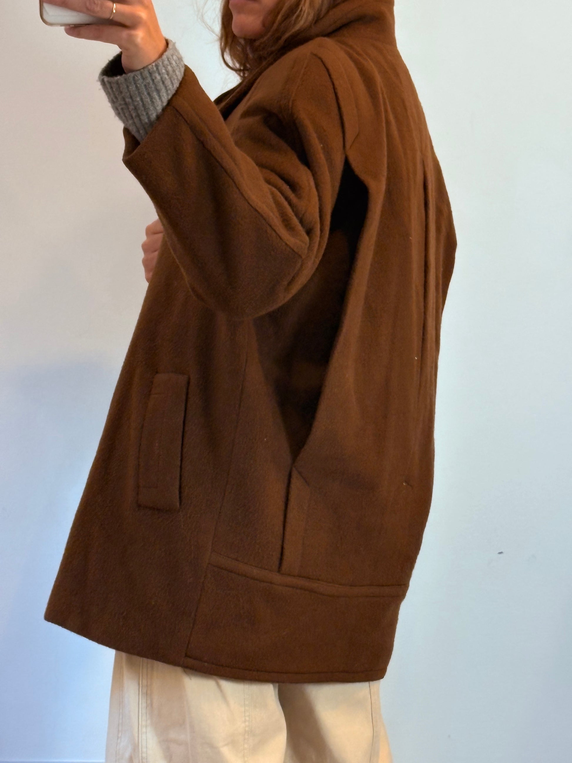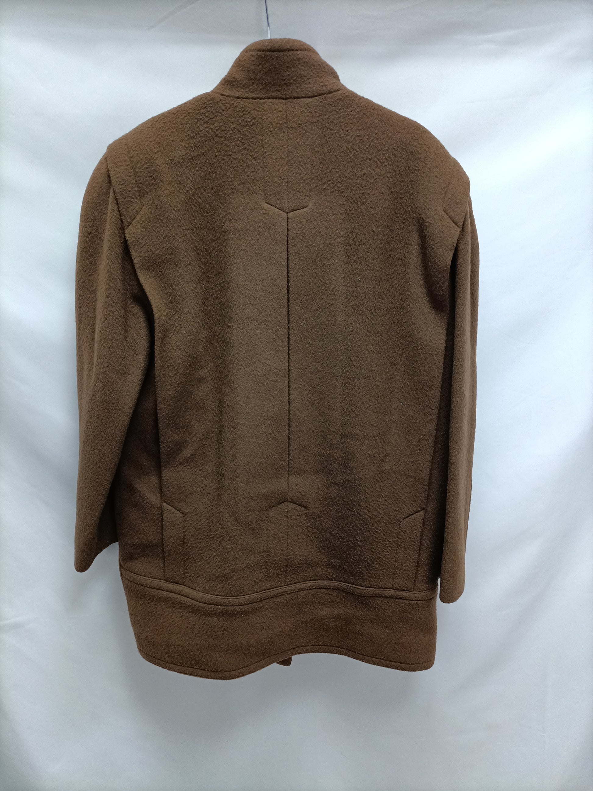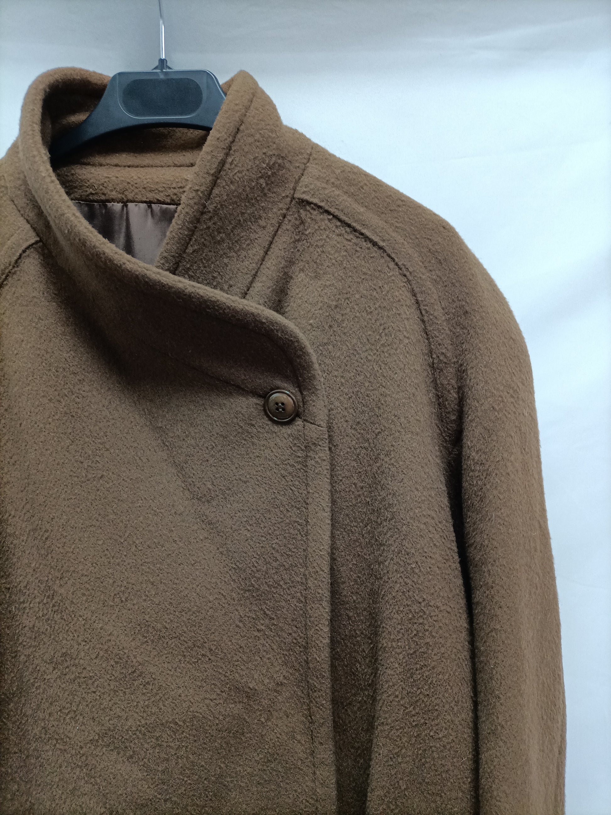 Abrigo de lana marrón cruzado estilo vintage con las mangas Abullonadas. Tiene hombreras (habría que cambiarlas)No es elástico. De sisa a sisa 60 cm largo 86 cm .