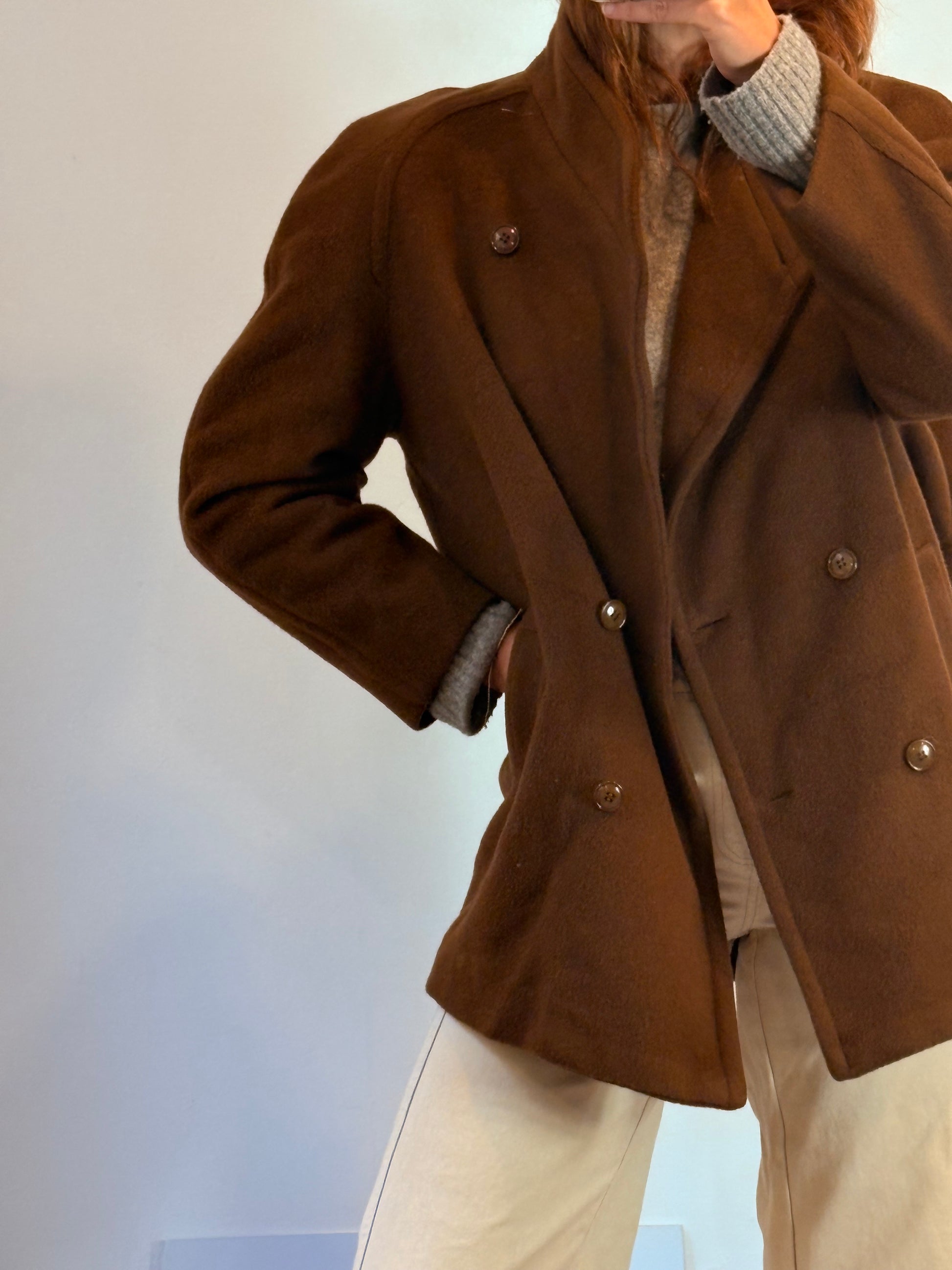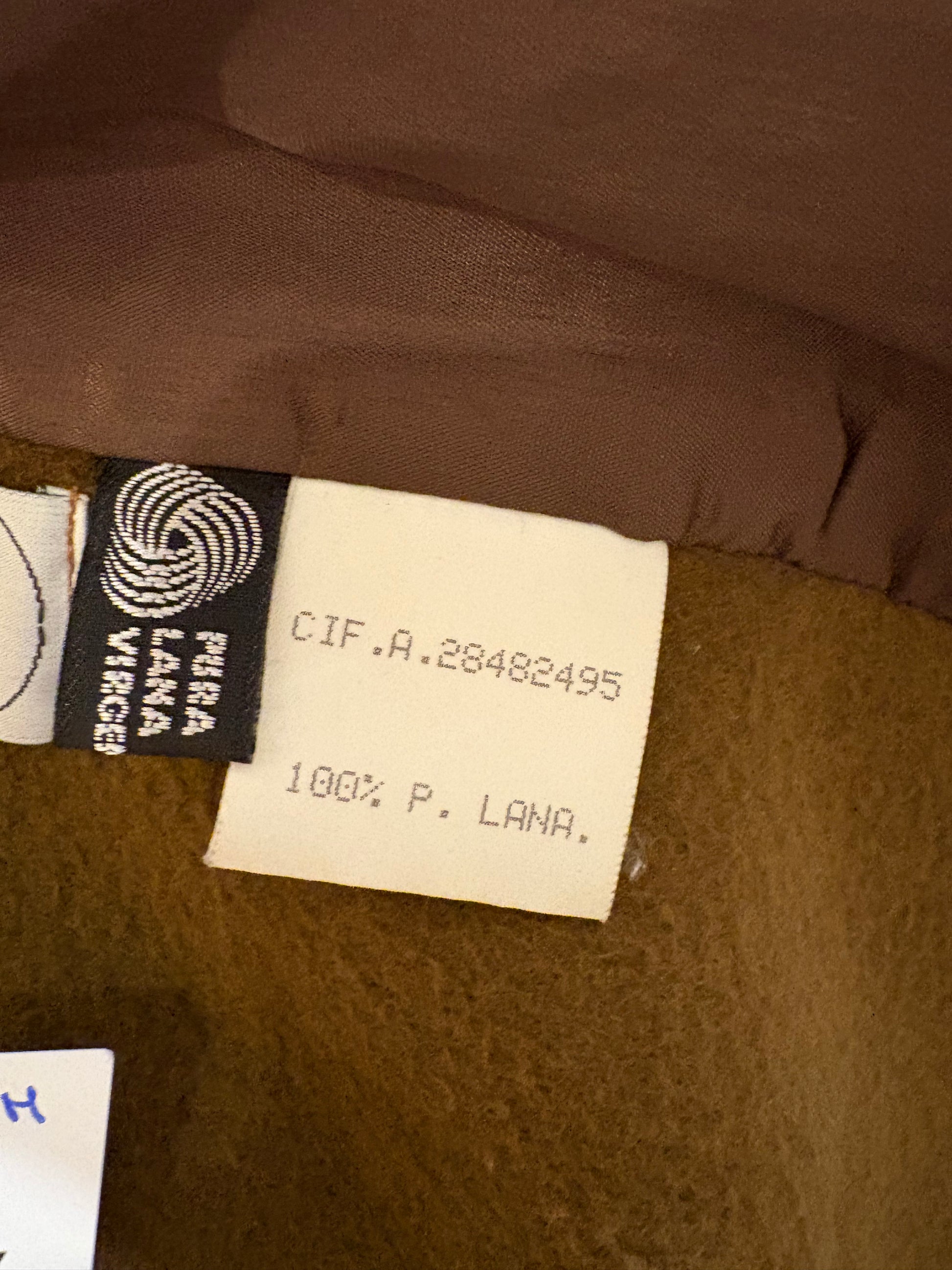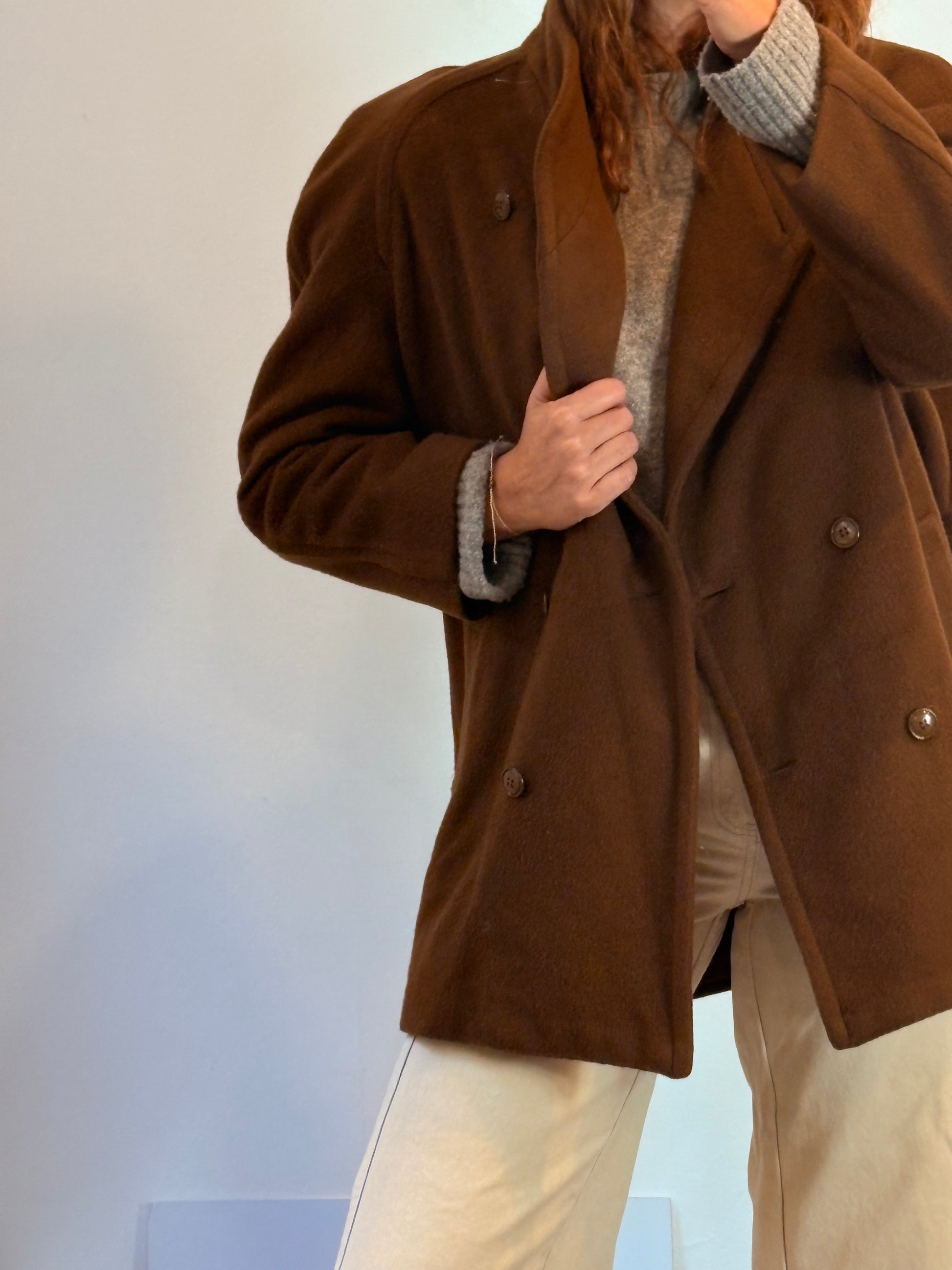 Abrigo de lana marrón cruzado estilo vintage con las mangas Abullonadas. Tiene hombreras (habría que cambiarlas)No es elástico. De sisa a sisa 60 cm largo 86 cm .
