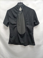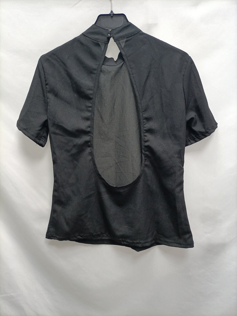 Top negro de manga corta con el cuello perkins y espalda abierta. No elástico. De sisa a sisa 46 cm largo 60 cm.