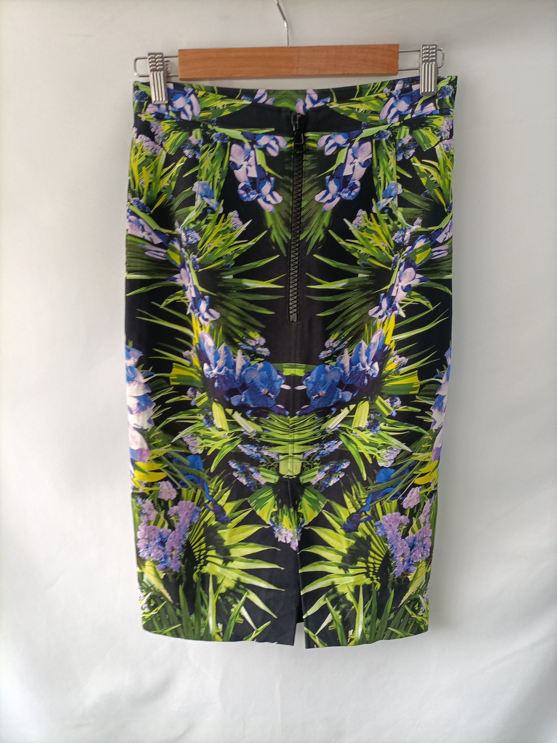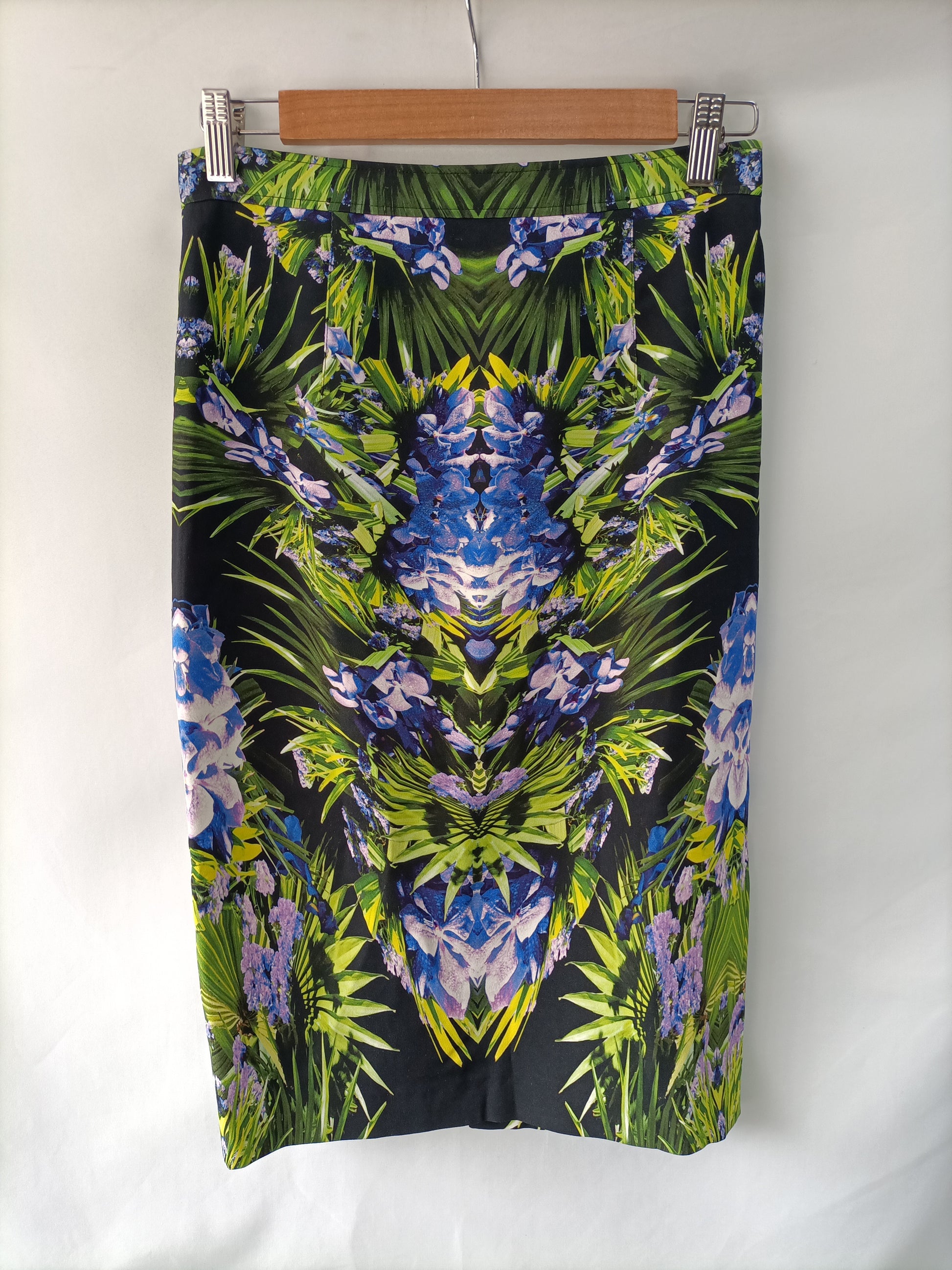 Falda ajustada negra con estampado de hojas y flores. Ajustada. Se abrocha con cremallera. Cintura 34 cm largo 64 cm