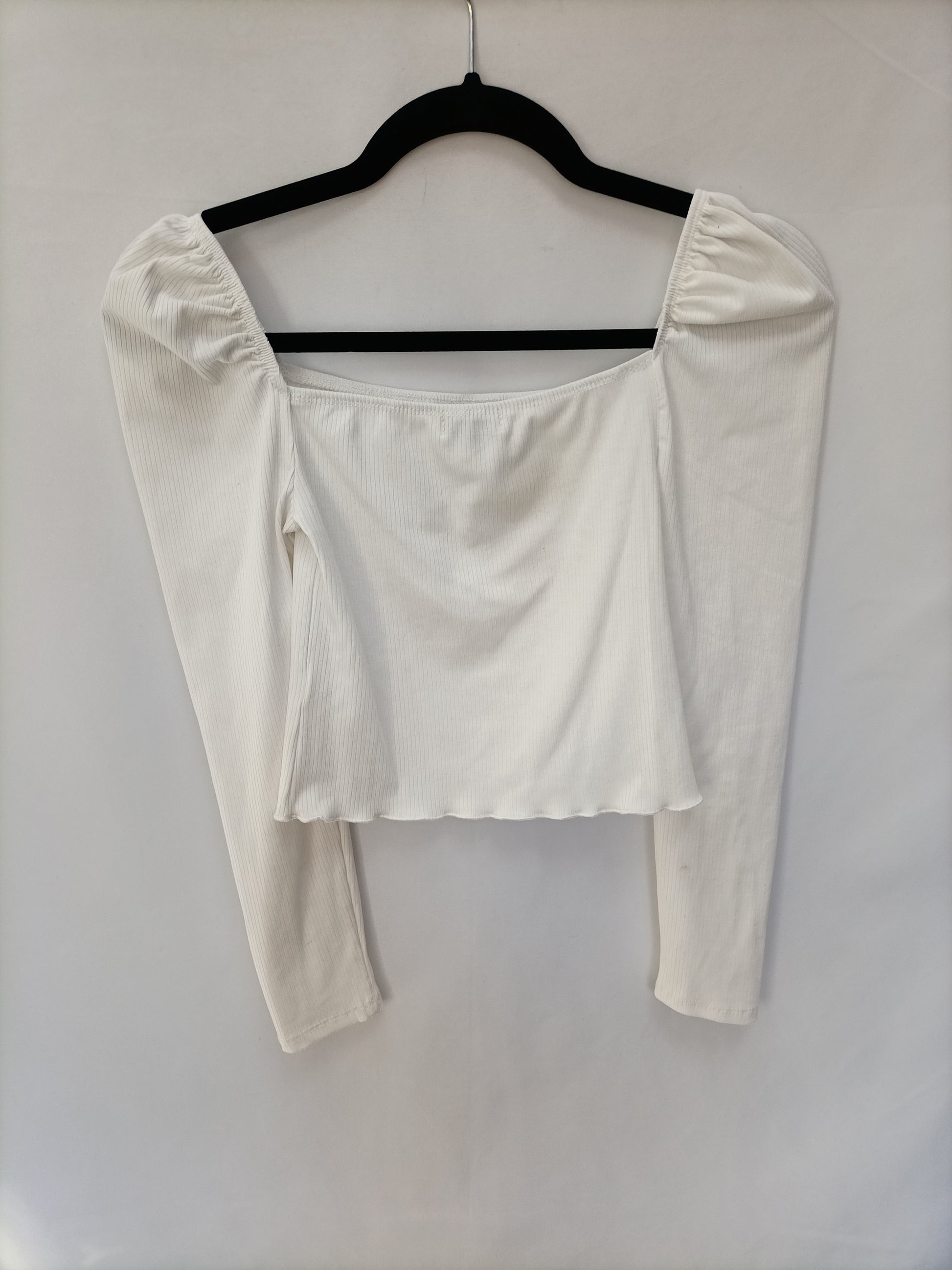 Top blanco cortito con escote cuadrado con los hombros un poco Abullonados. Ajustado. Elastico. Largo 28 cm