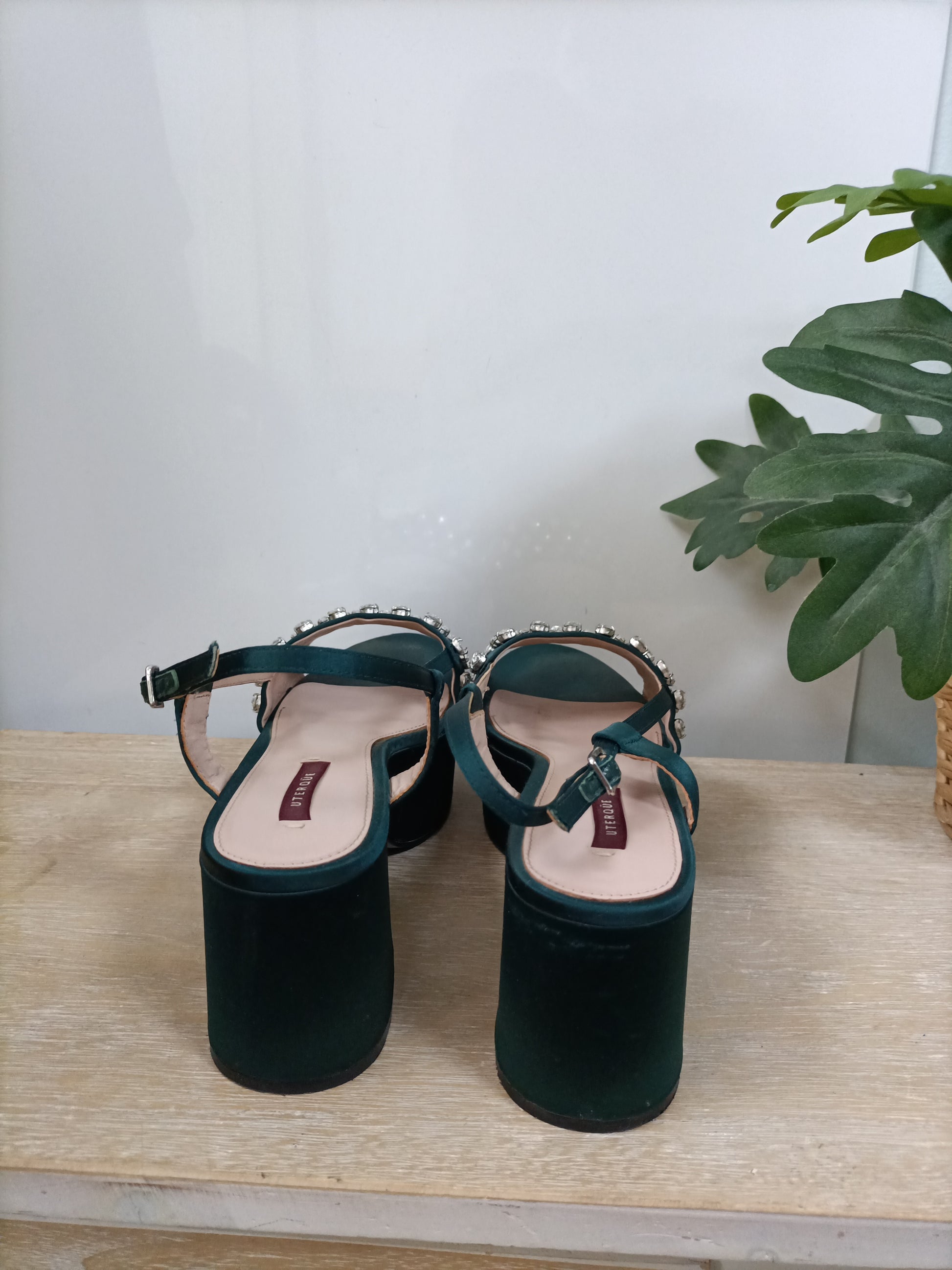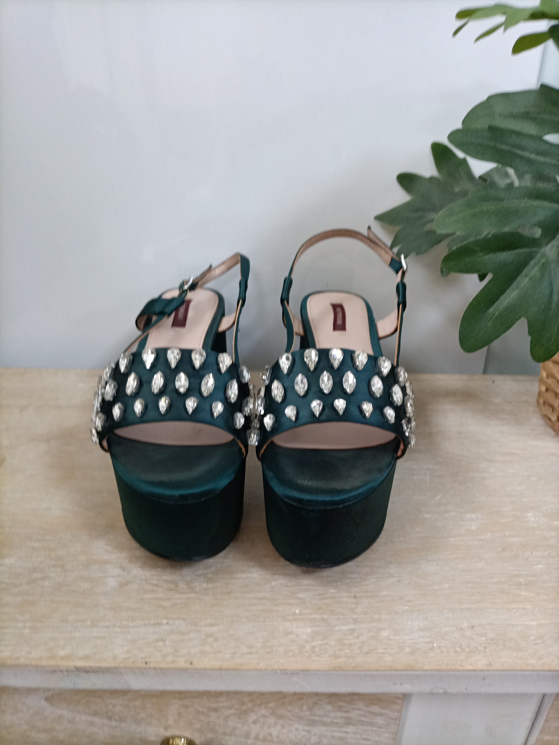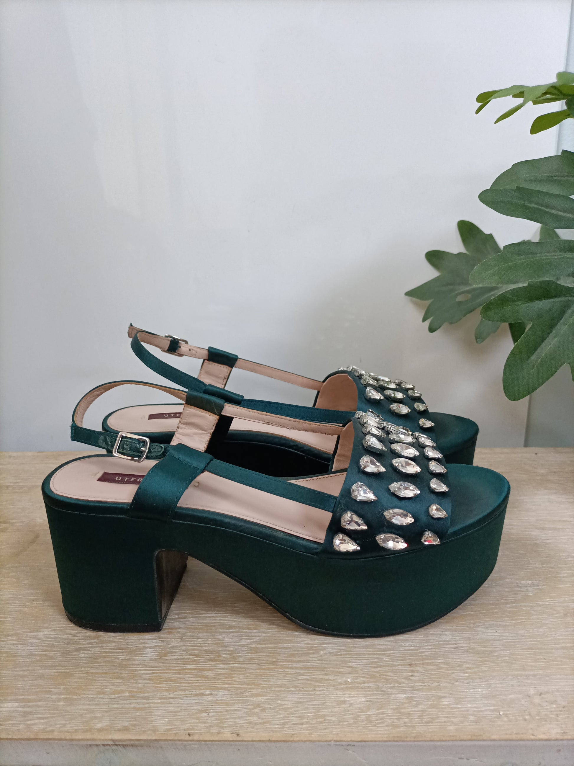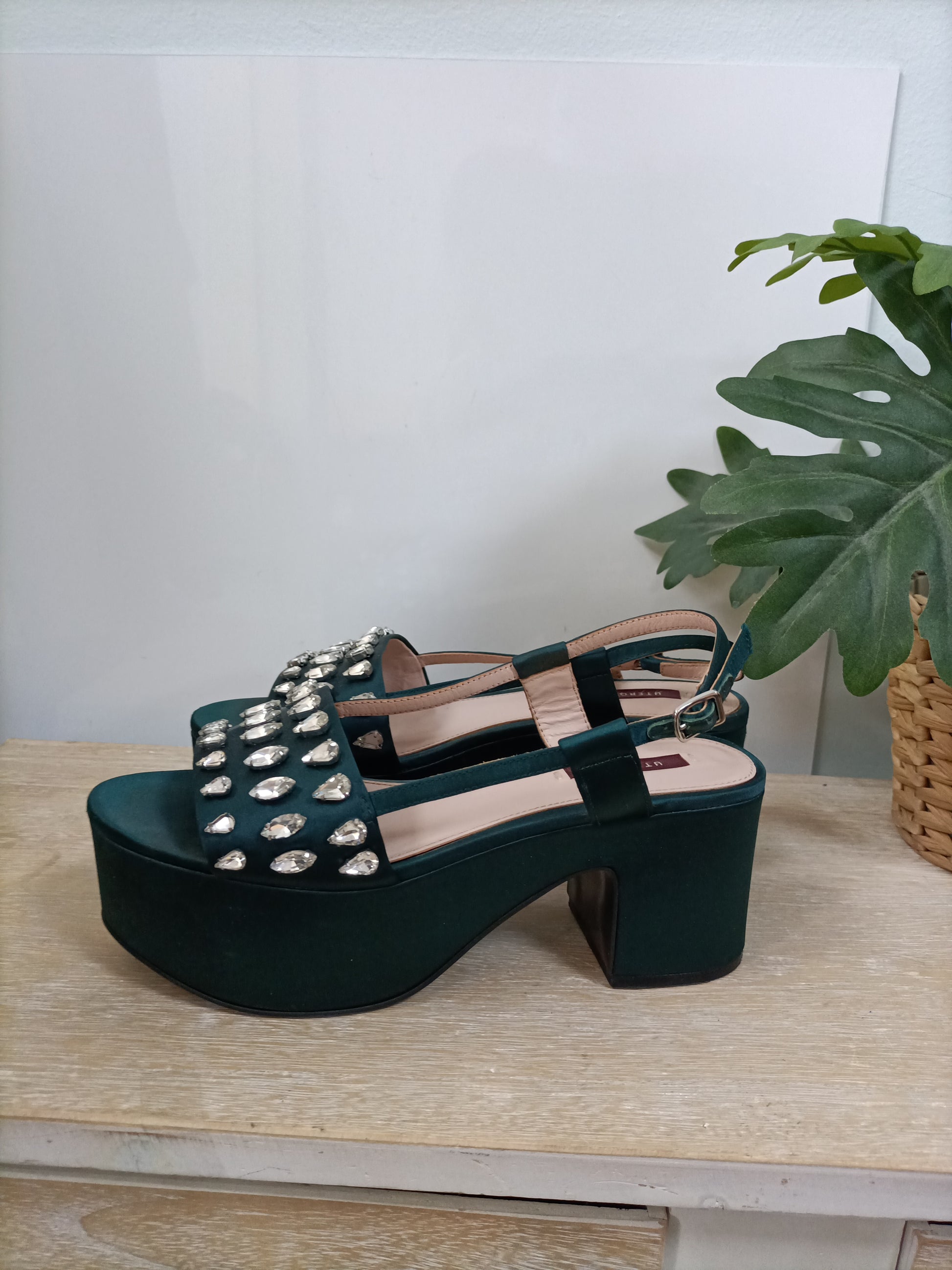 sandalias de raso verde estilo Plataforma con pedrería. Tacón 7,5 plataforma 5,5 cm . Tara: falda una piedra en un zapato