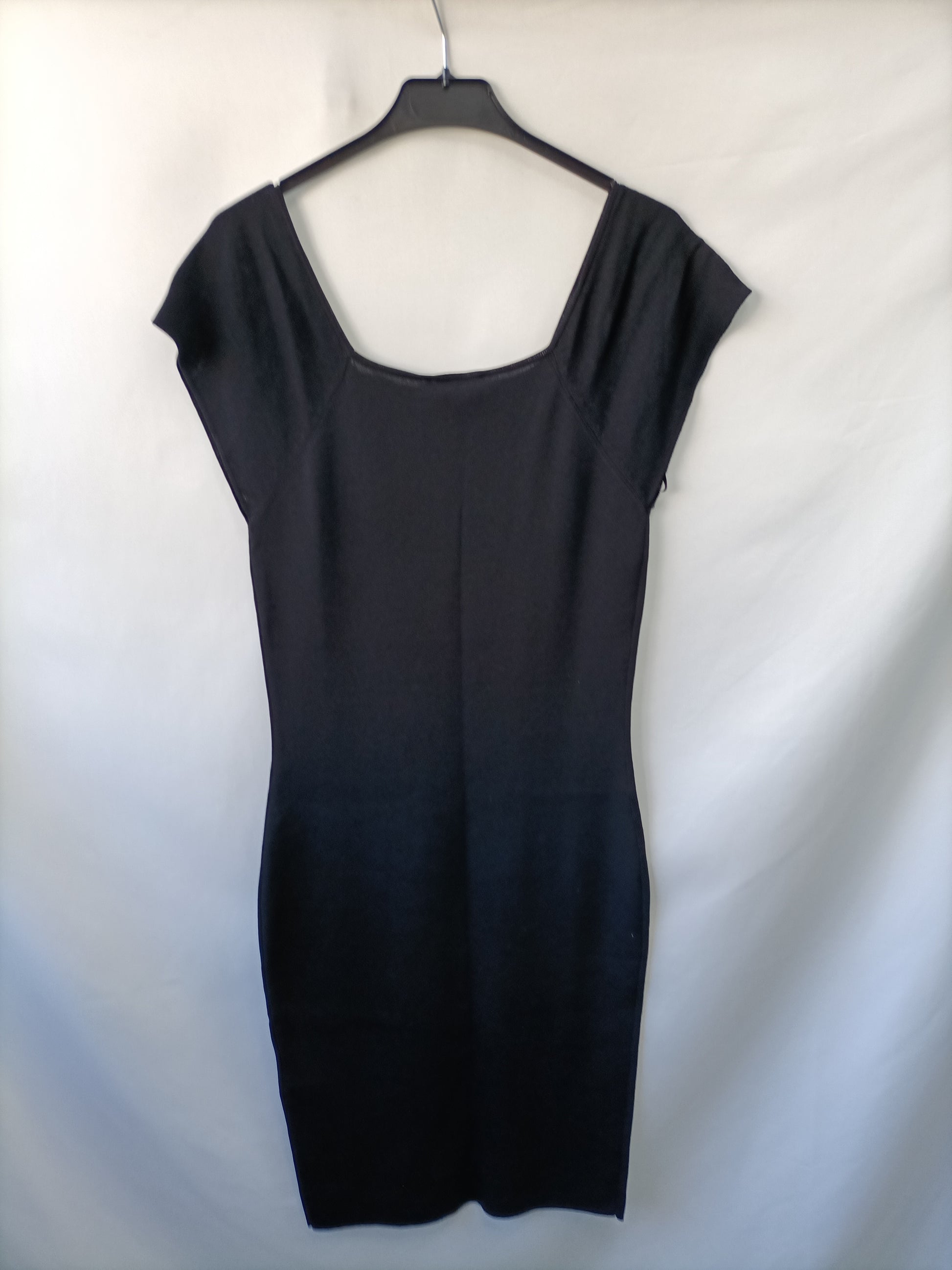 NIEVO CON ETIQUETA. Vestido midi negro de punto con tachuelas en la parte delantera. elástico. Largo 103 cm