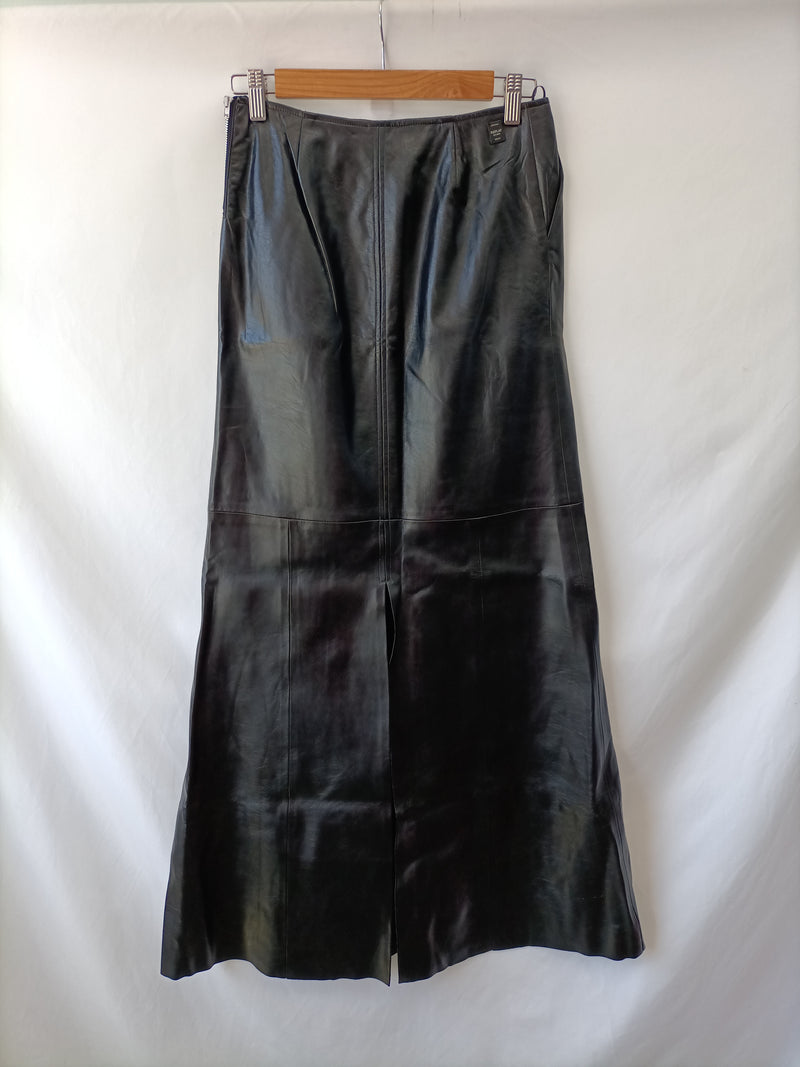 faldas larga negra efecto piel con apertura en la parte trasera. no elástica. Larga Cintura 32 cm Largo 97 cm.