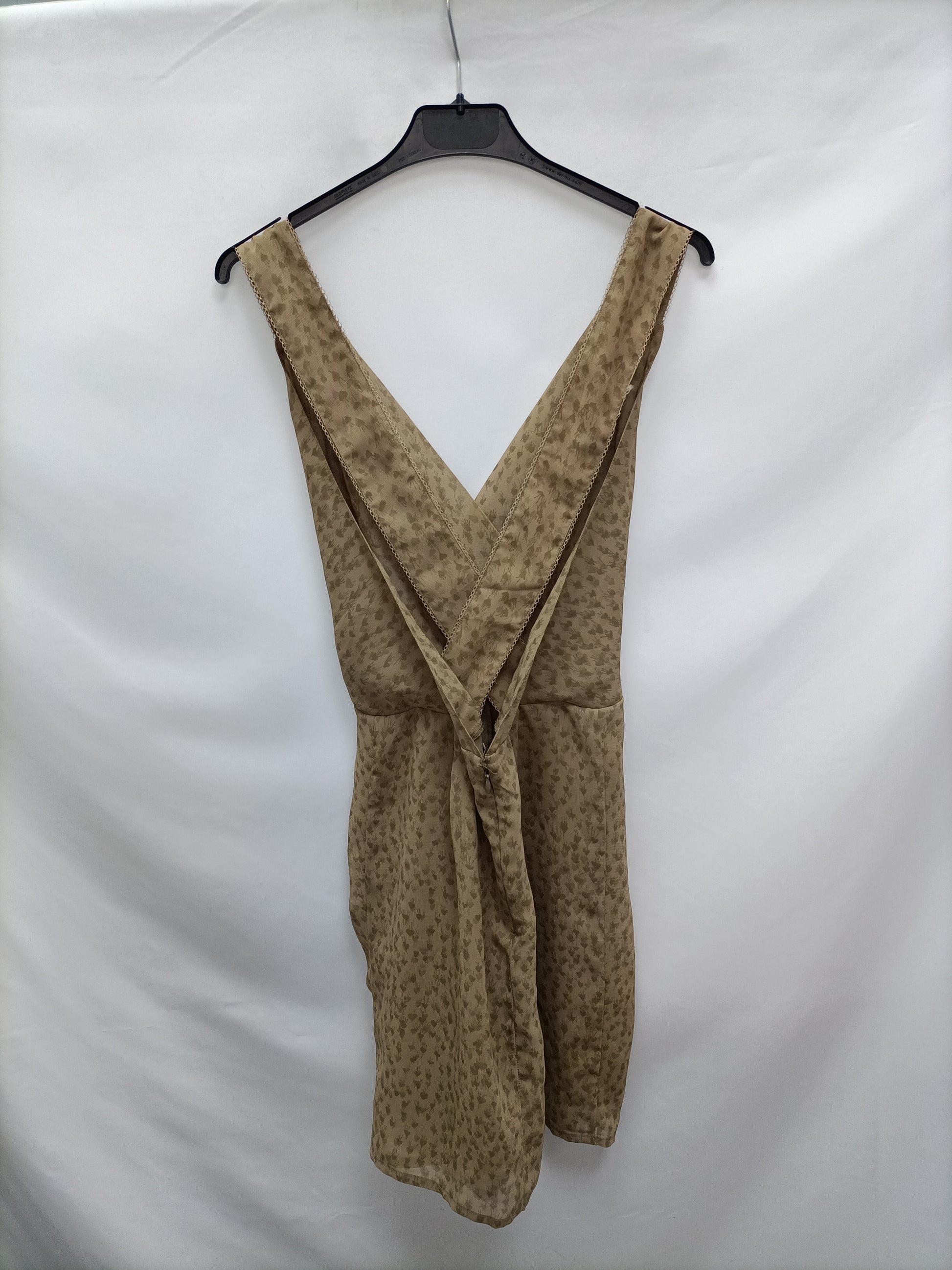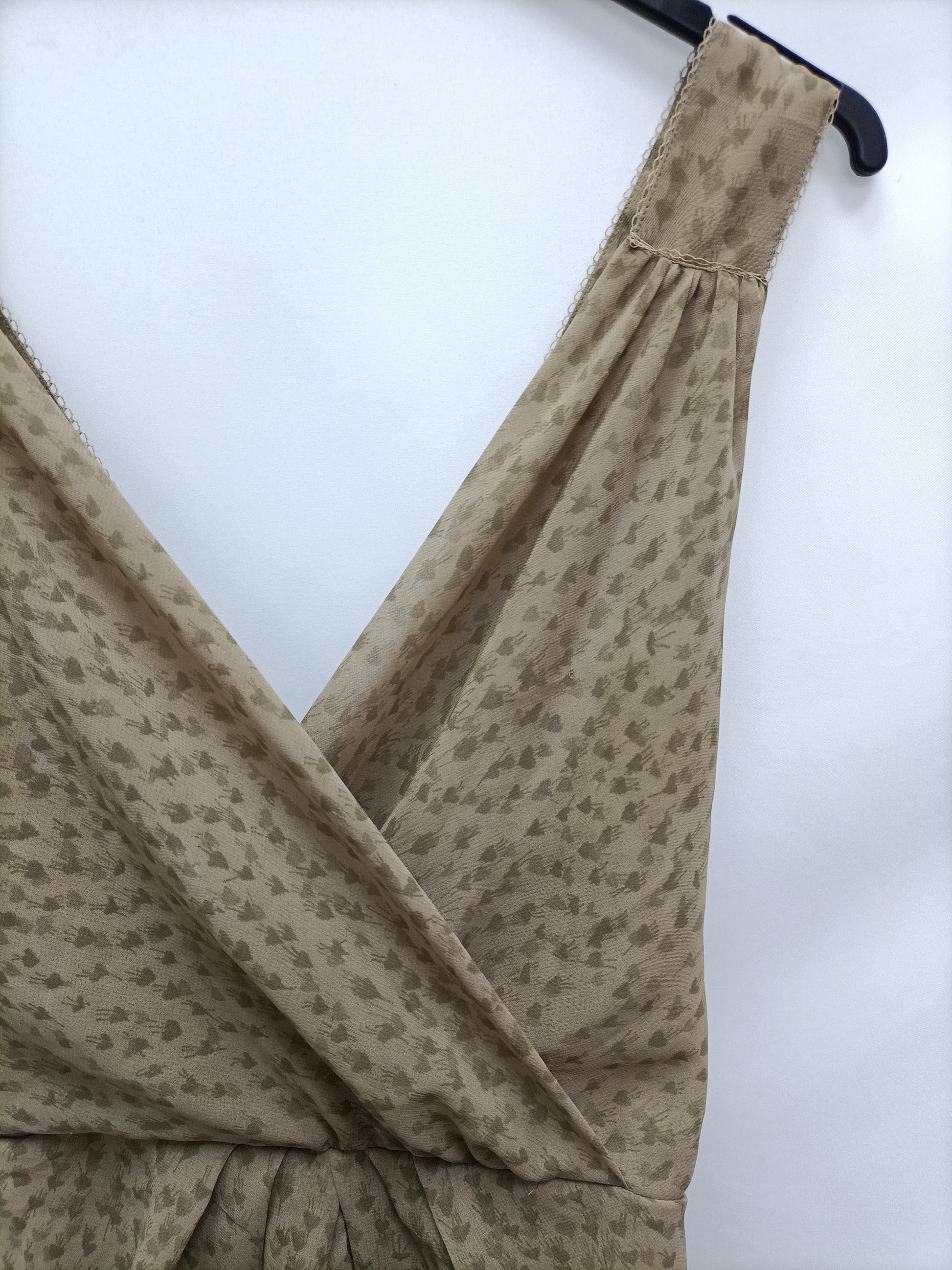 Vestido corto verde caqui cruzado con estampado de corazones. Espalda baja. No elástico . De sisa a sisa 31 cm largo 88 cm