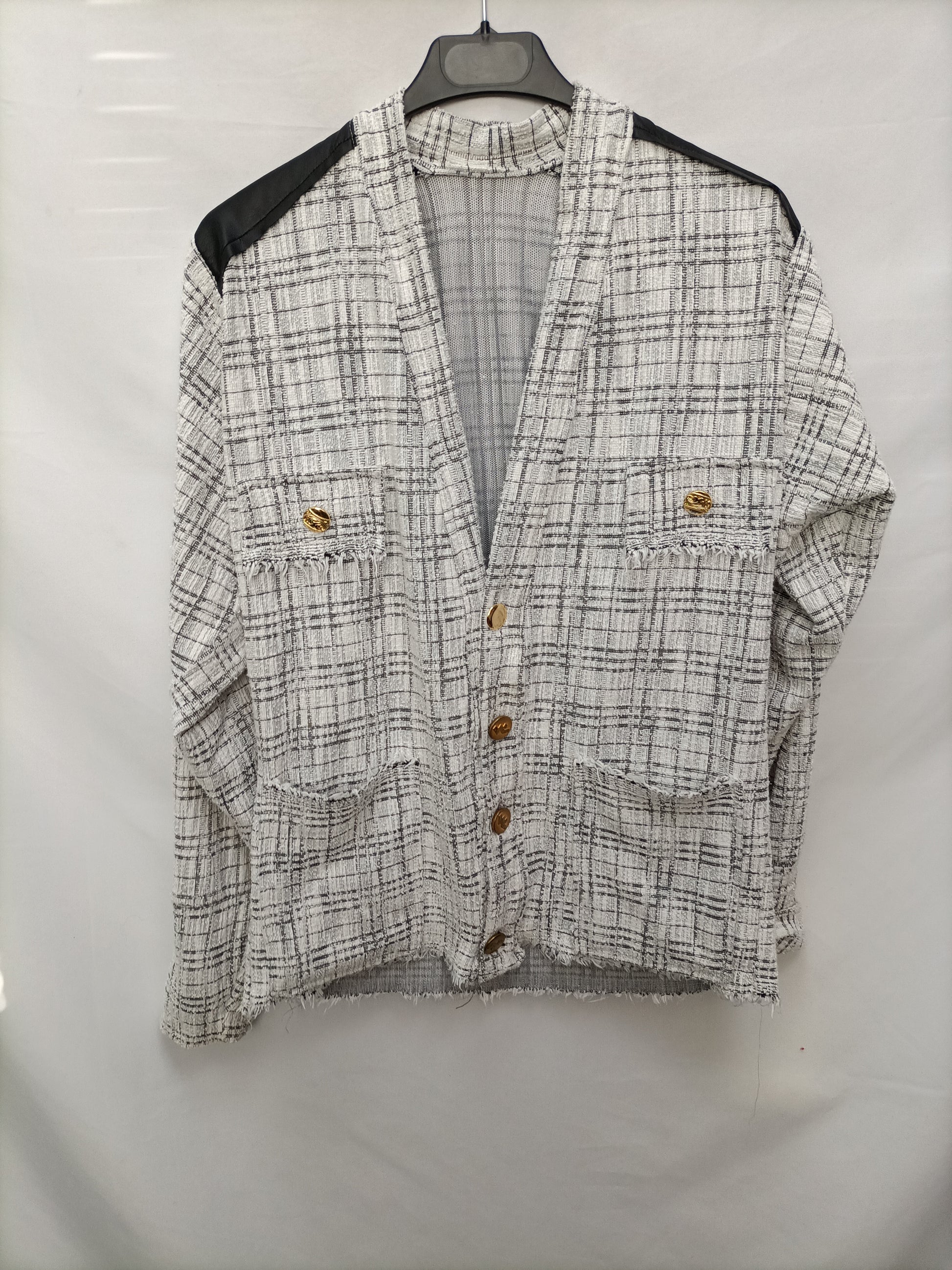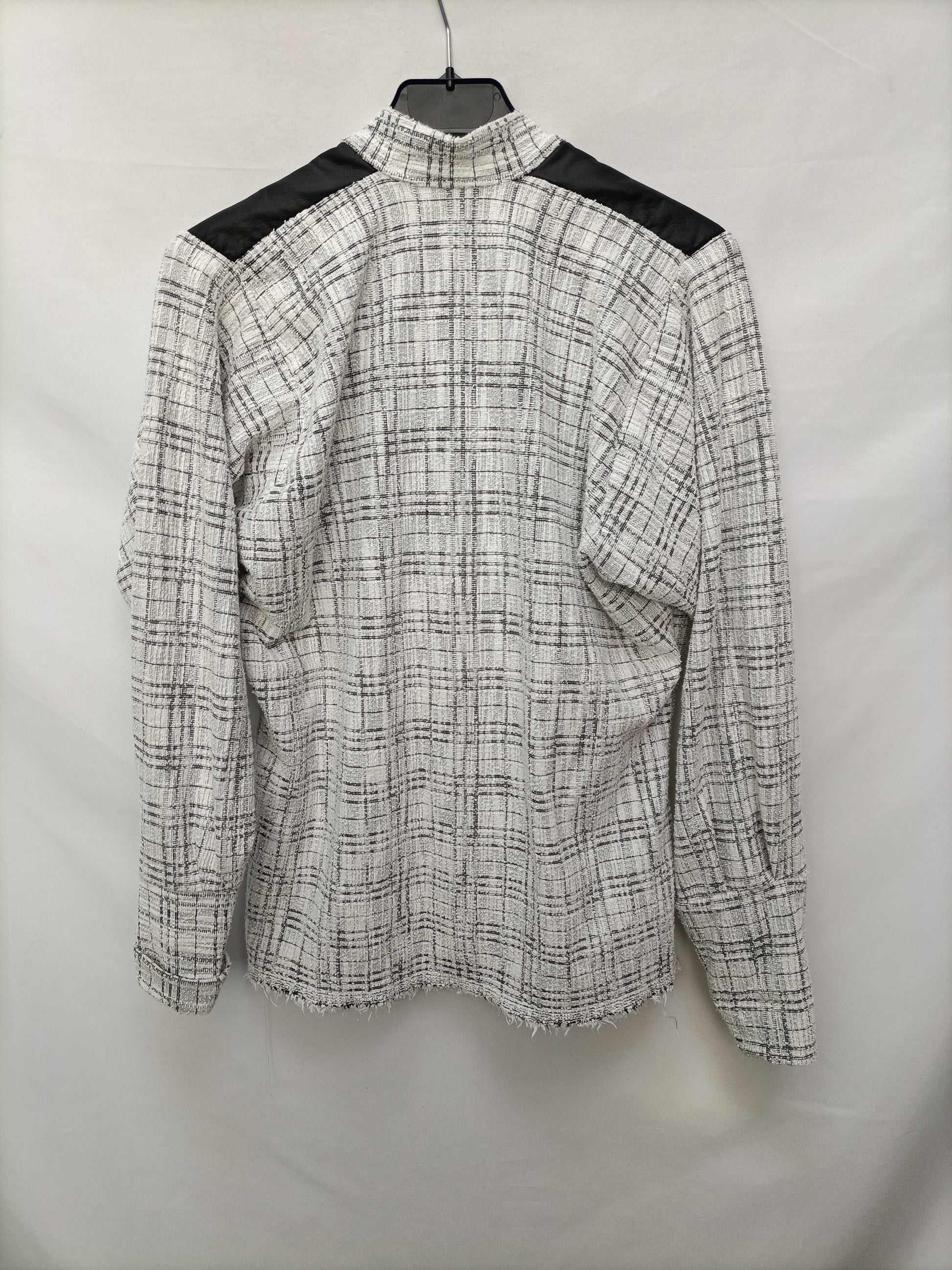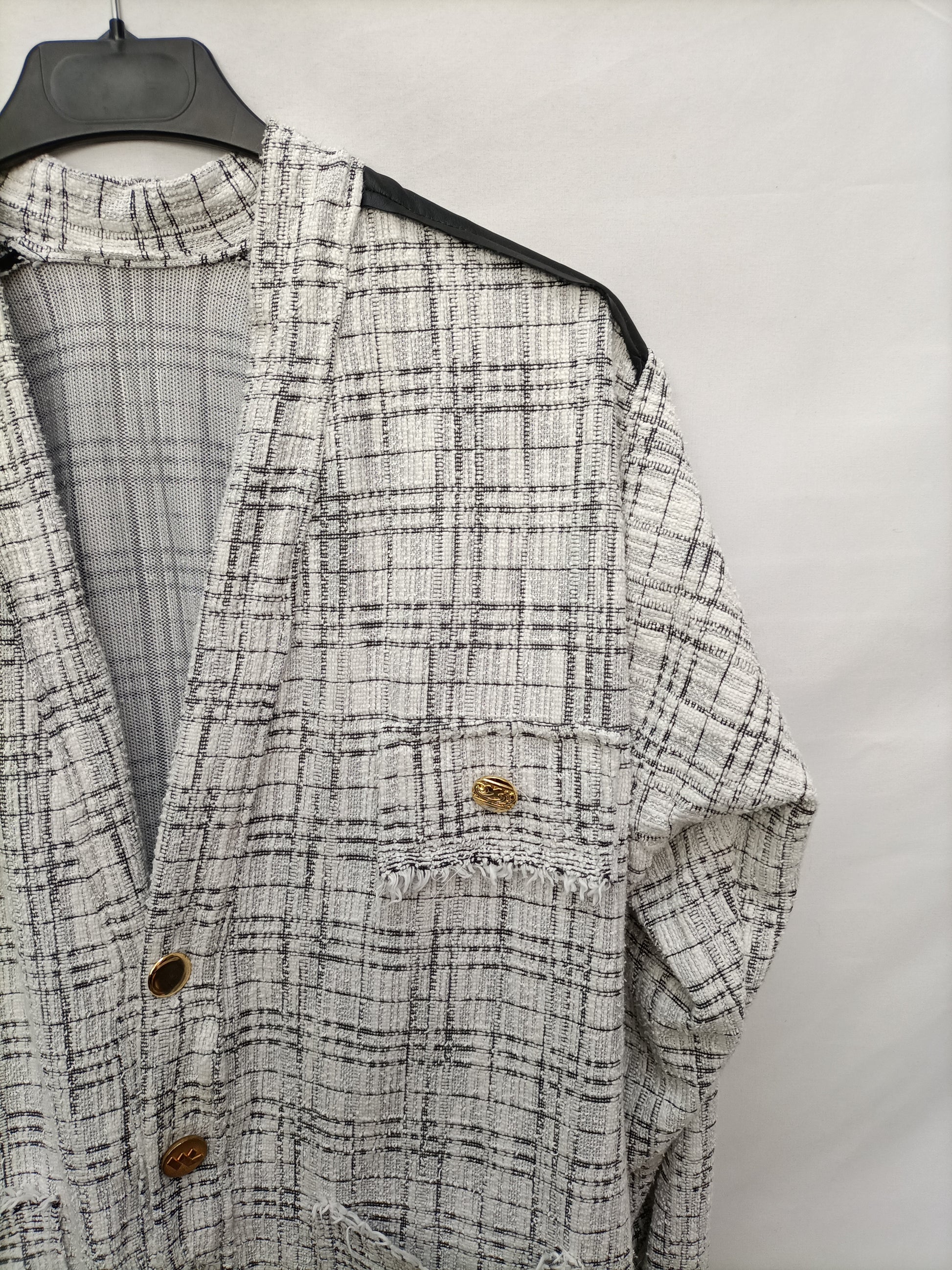 Blazer/ camisa elastica de tejido tweed blanco y negro ajustada en la cintura. Detalle de botones Dorados. Elastico. Largo 66 cm