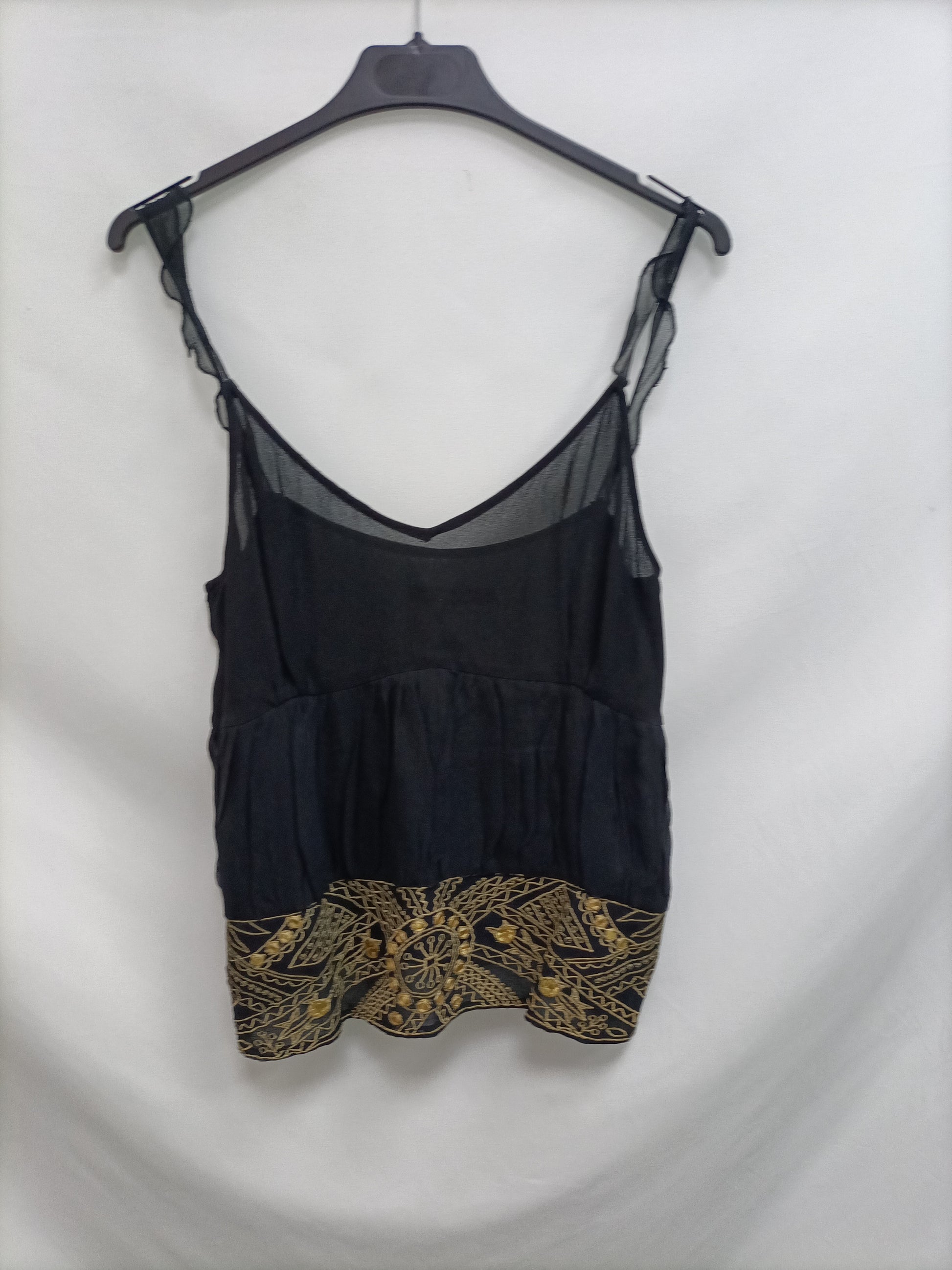 Top negro semitransparente con volante en los tirantes. Detalle de bordados y abalorios. De sisa a sisa 46 cm largo 60 cm
