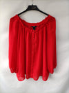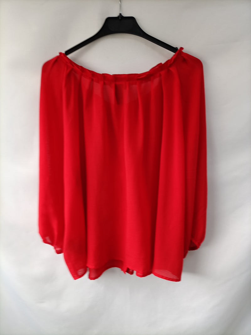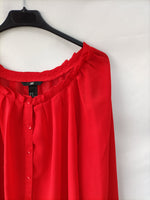 Blusa roja fluida amplia con el cueello pliado y abotonada. largo 54 cm