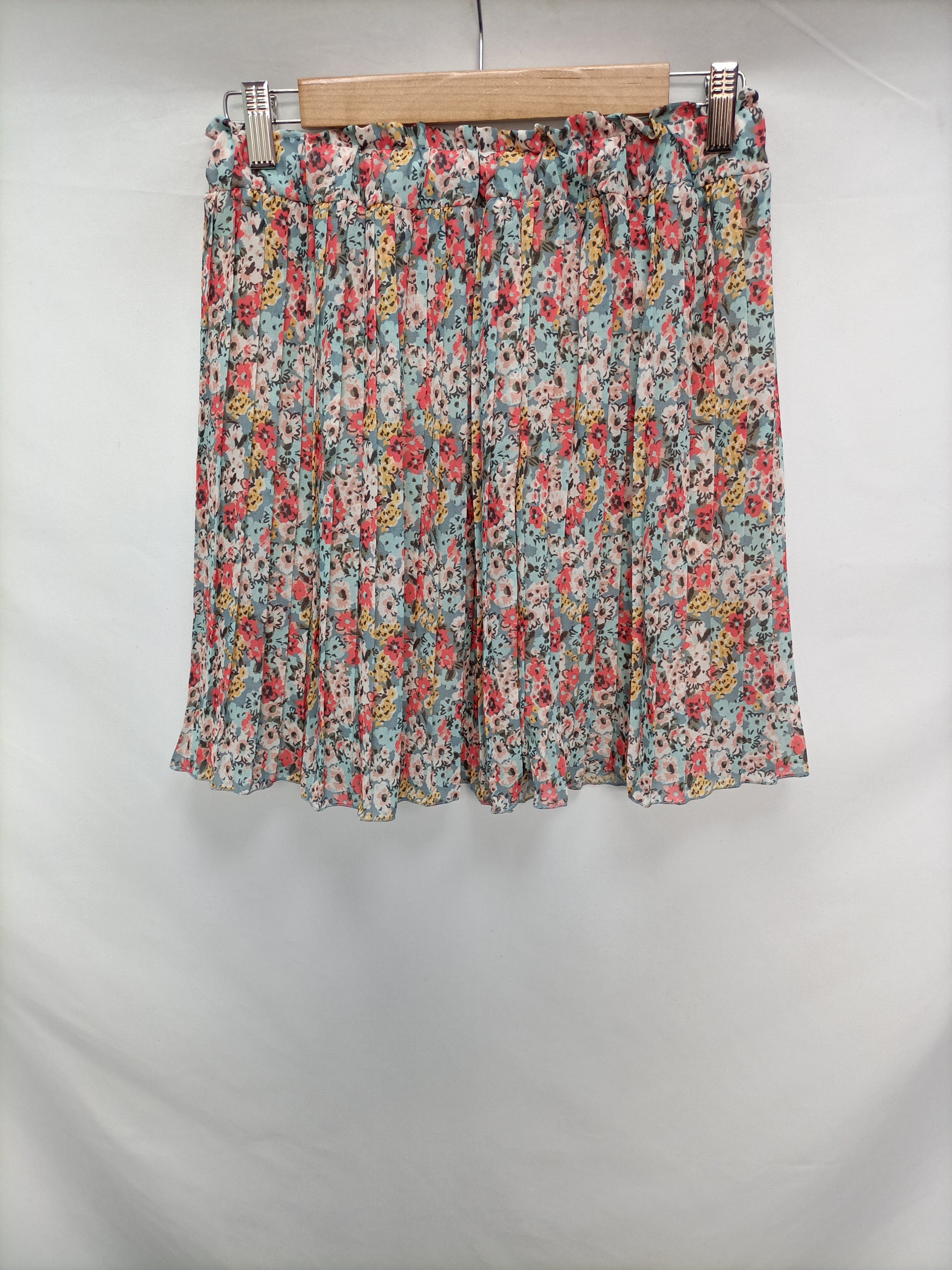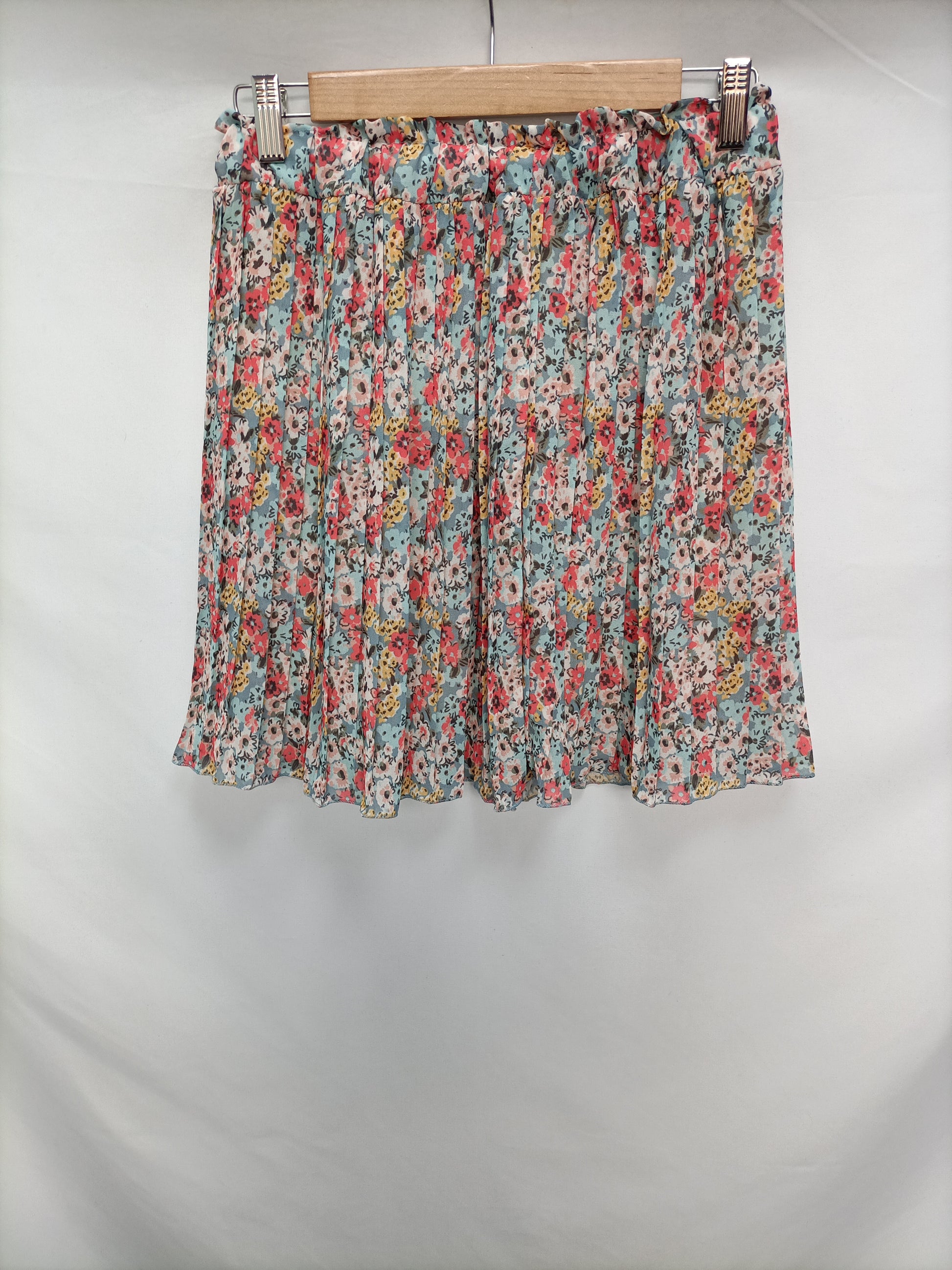 Falda corta de tablas con estampado de flores y cintura elástica. Largo 46 cm