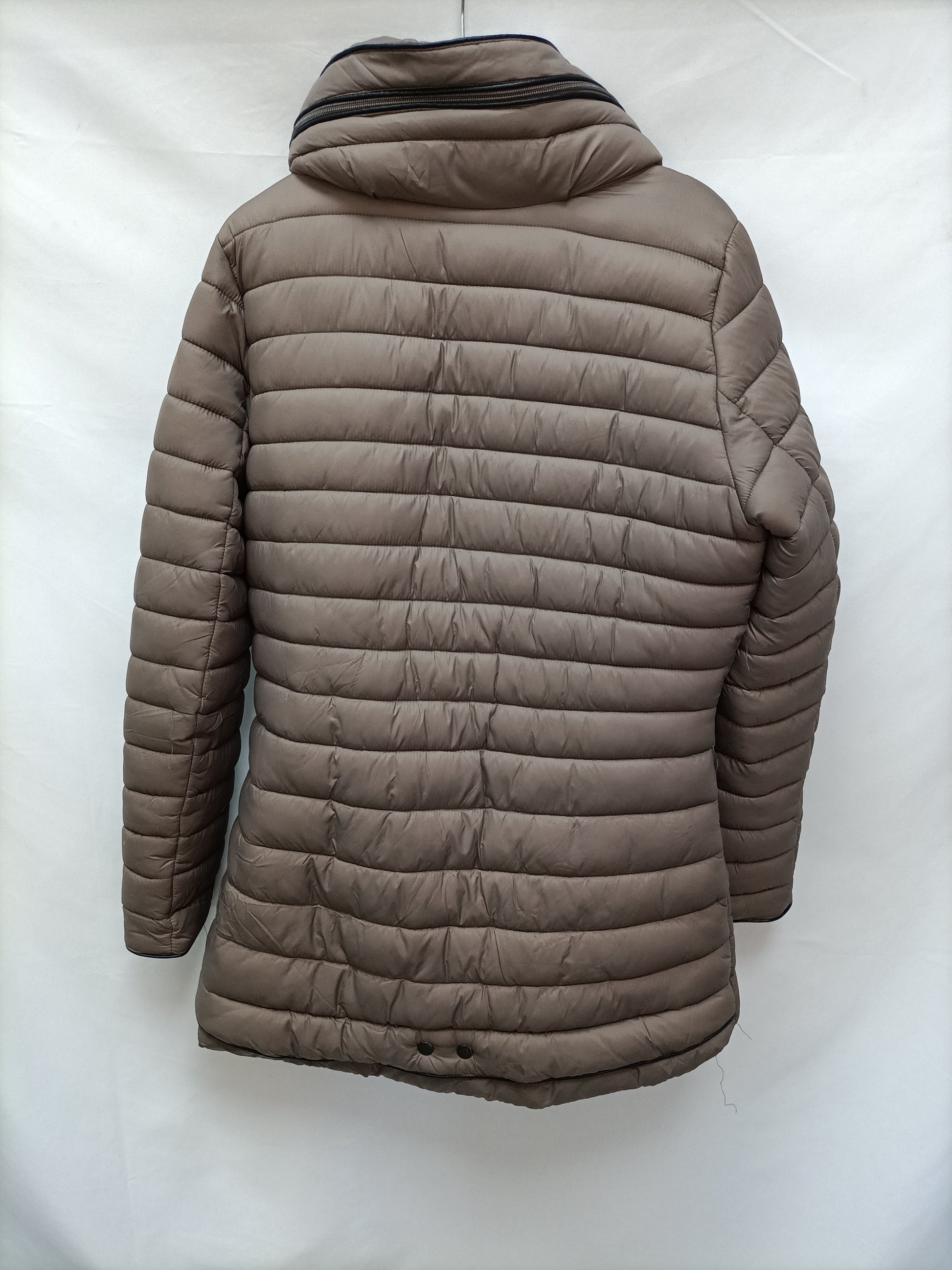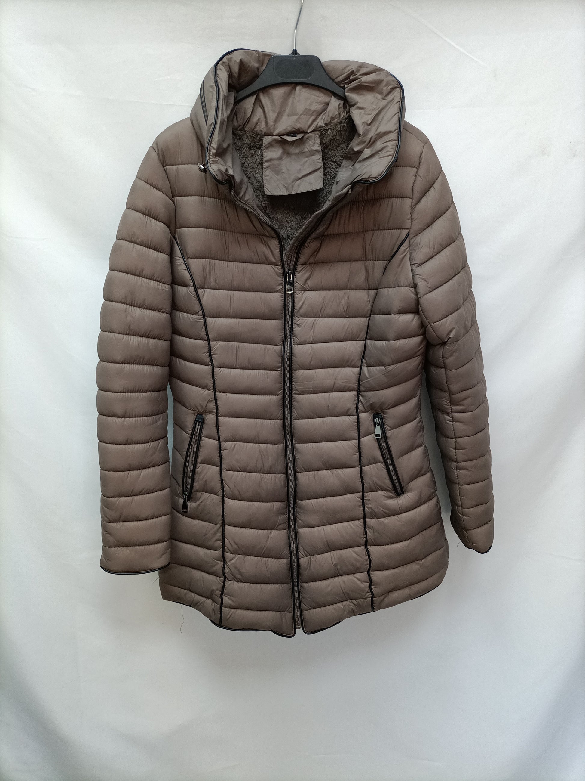 Plumas marrón ligero con de pelito. Se abrocha con cremallera. No elástico. De sisa a sisa 51 cm largo 84 cm.