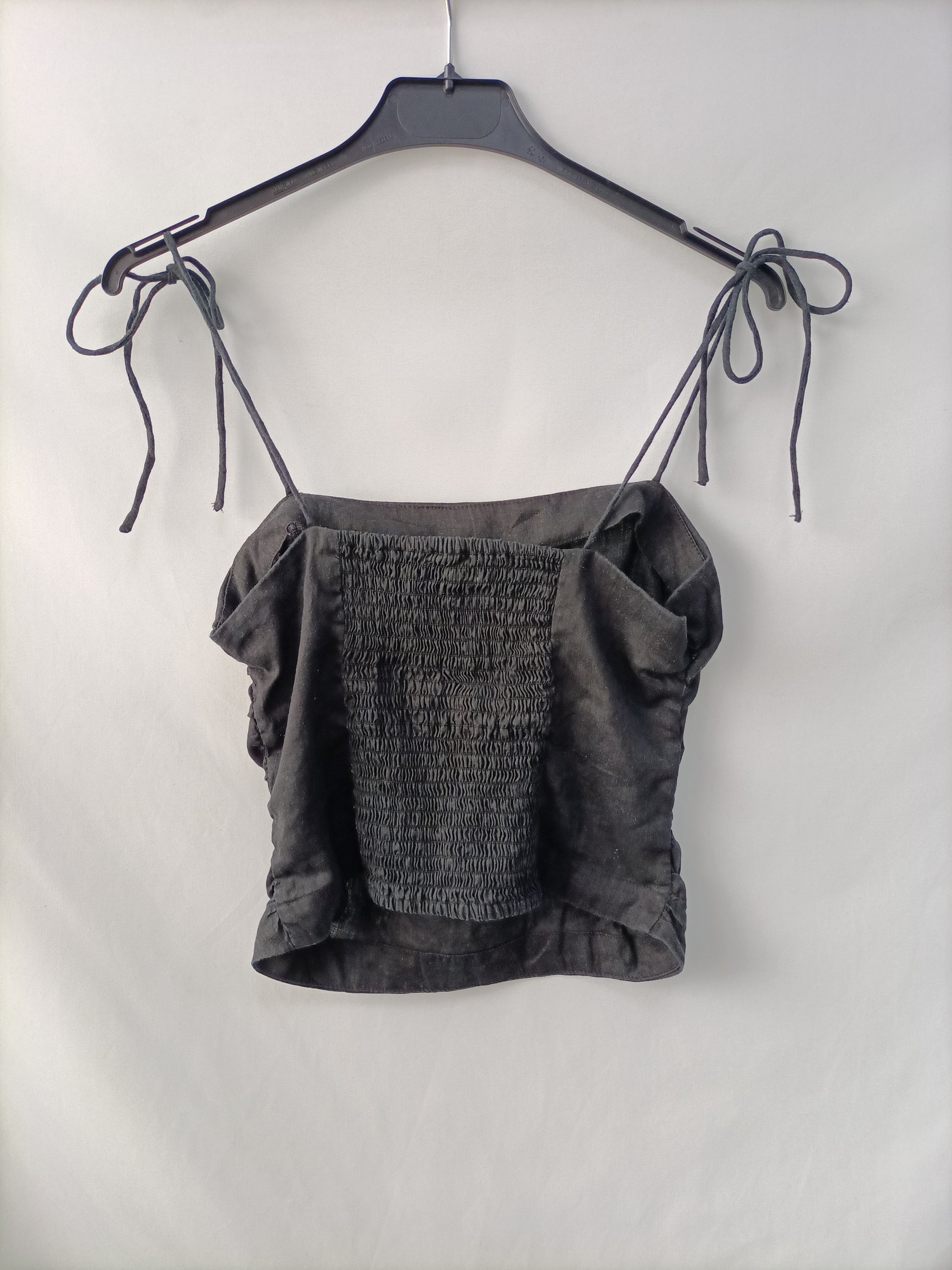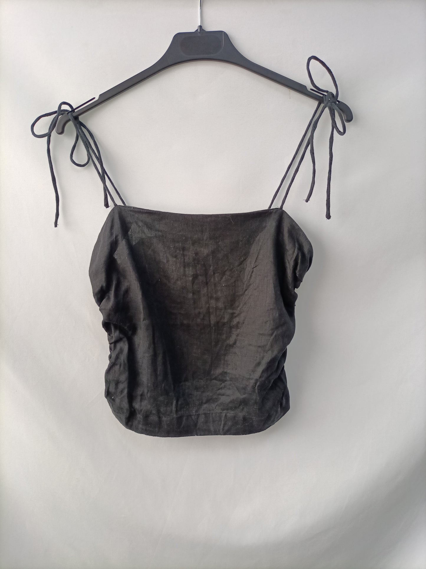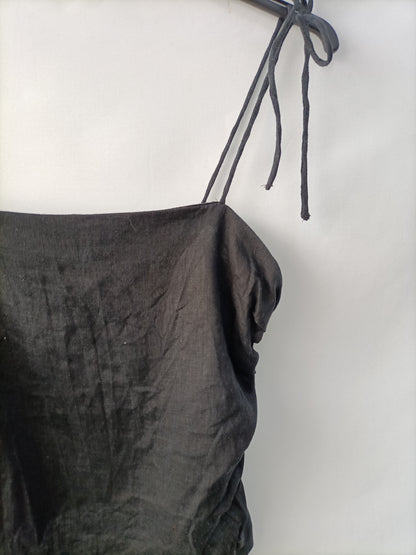 Top negro de lino con los tirantes ajustables y espalda elástica. Fruncido por lo laterales. largo 29 cm.