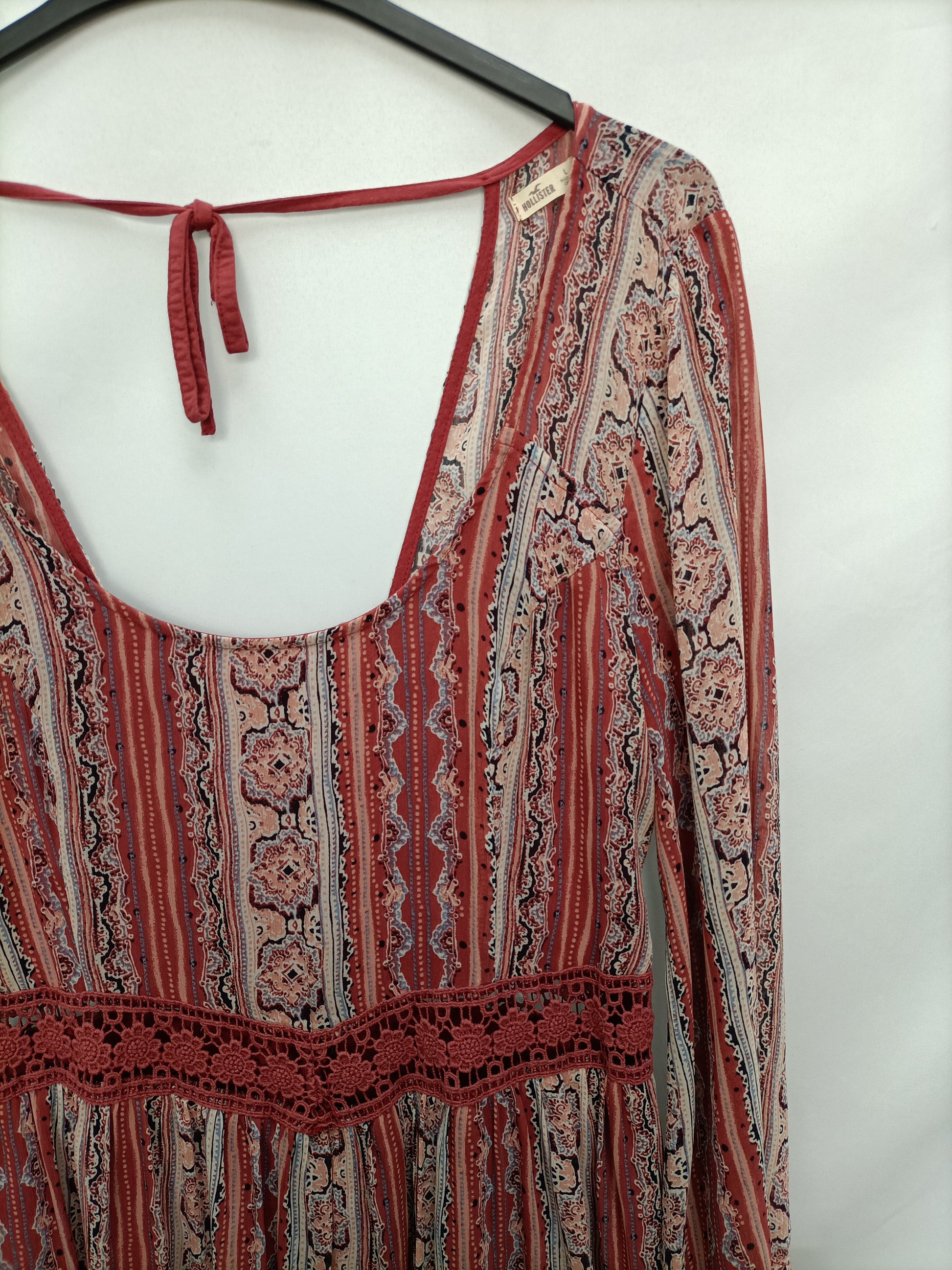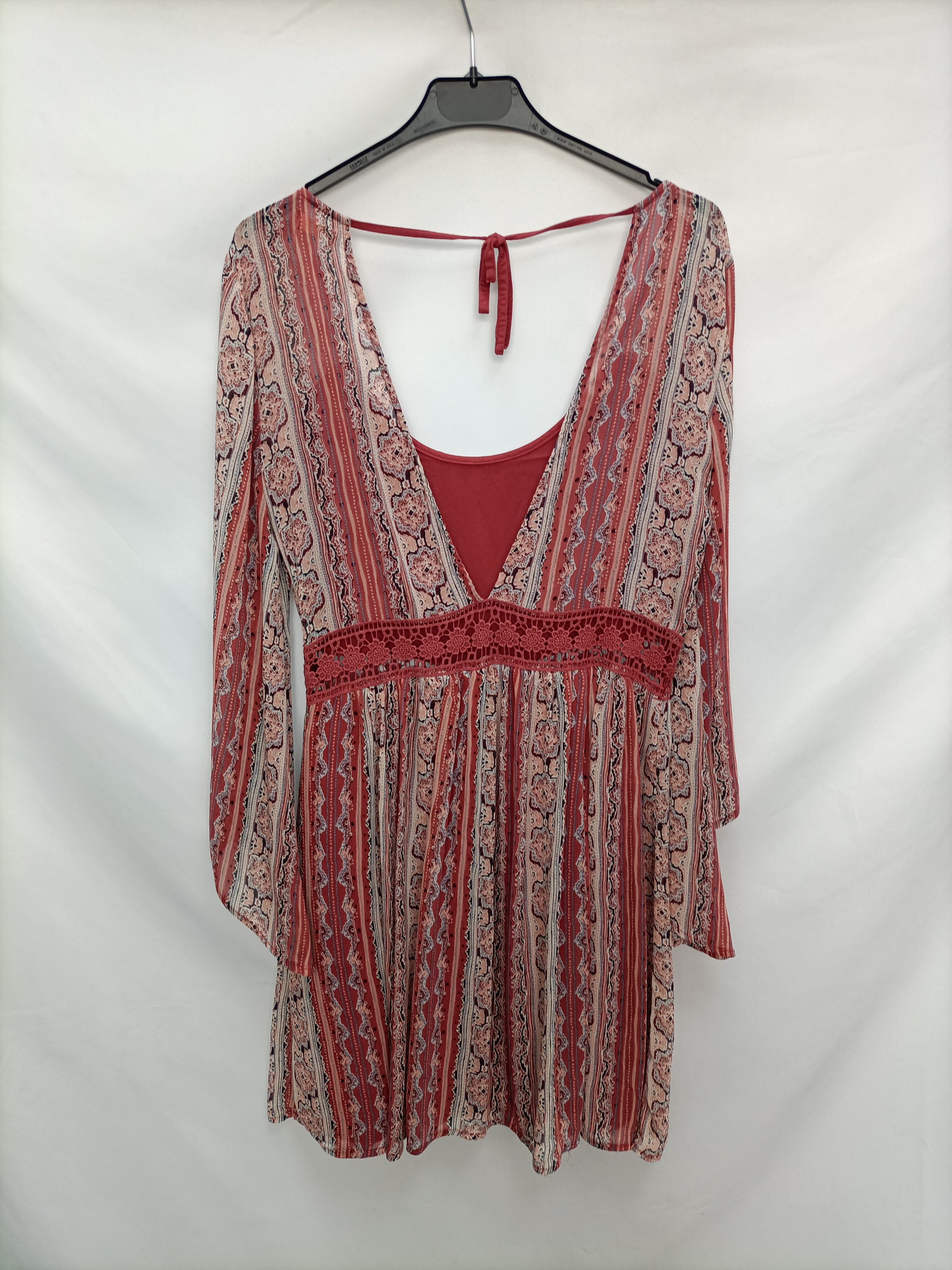 Vestido fluido estampado con las mangas acampanadas y detalle de encaje. Espalda abierta. De sisa a sisa 46 cm Largo 88 cm