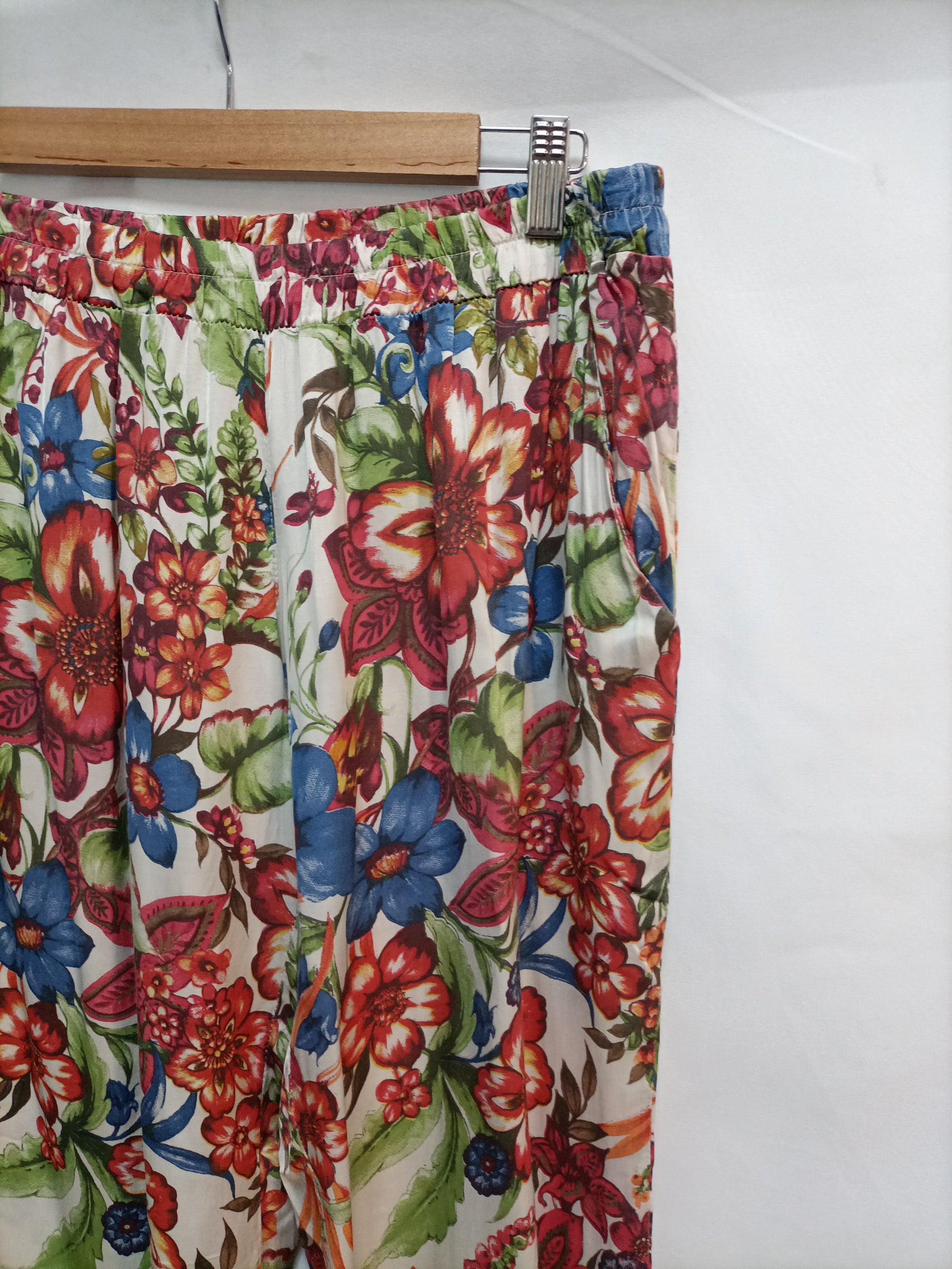 Pantalón fluido beige con estampado de flores en varios tonos. Cintura elástica. Largo 99 cm