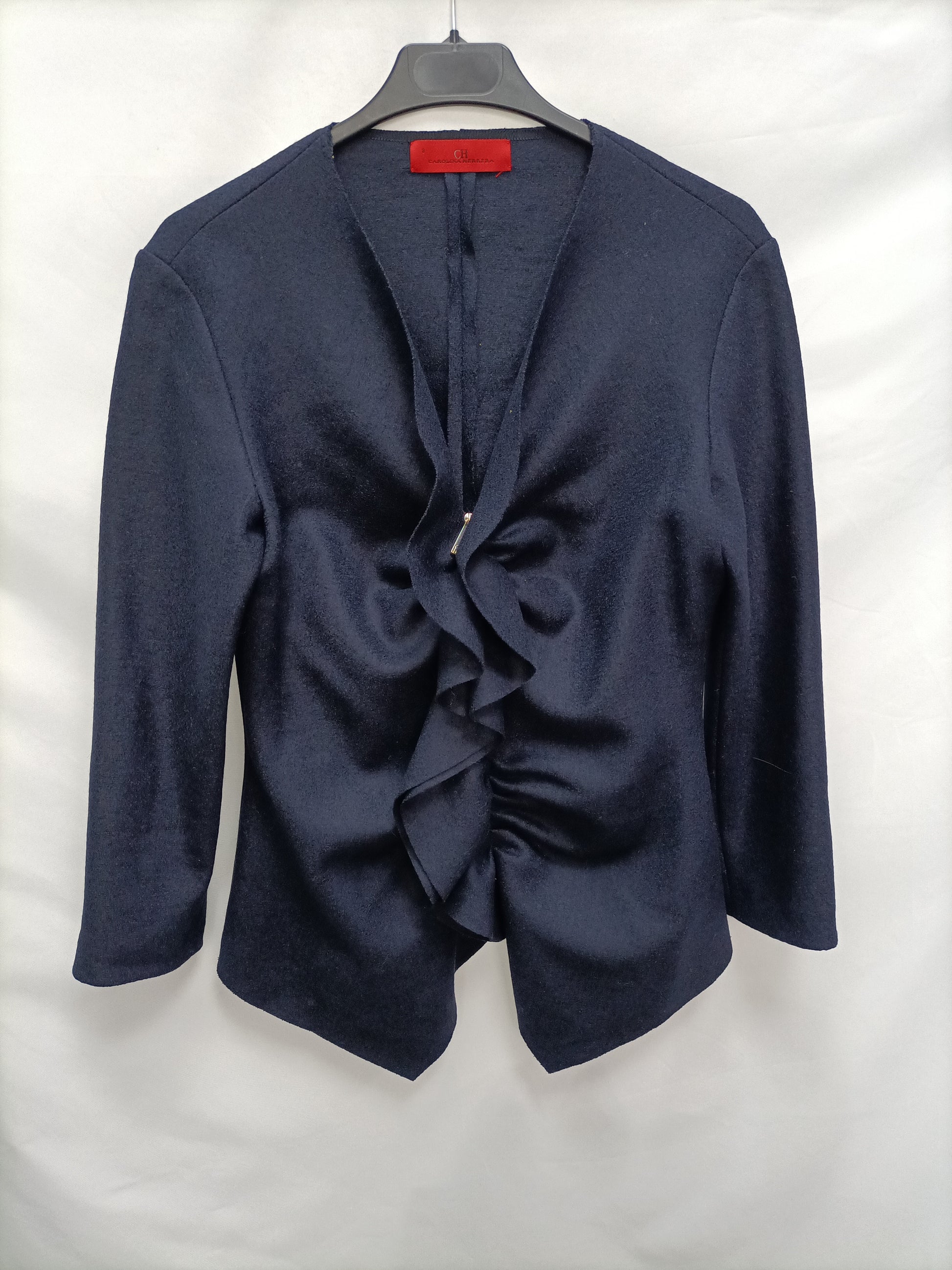 Chaqueta azul finita de tejido tipo Pañoccon volante en la zona de la cremallera. No Elastico. de sisa a sisa 42 largo 59 cm.