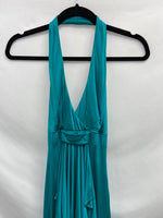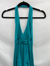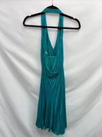 Vestido azul verdoso, de tejido tipo licra, atado al cuello y con espalda al aire. Es elástico y fluido. Largo 108 cm