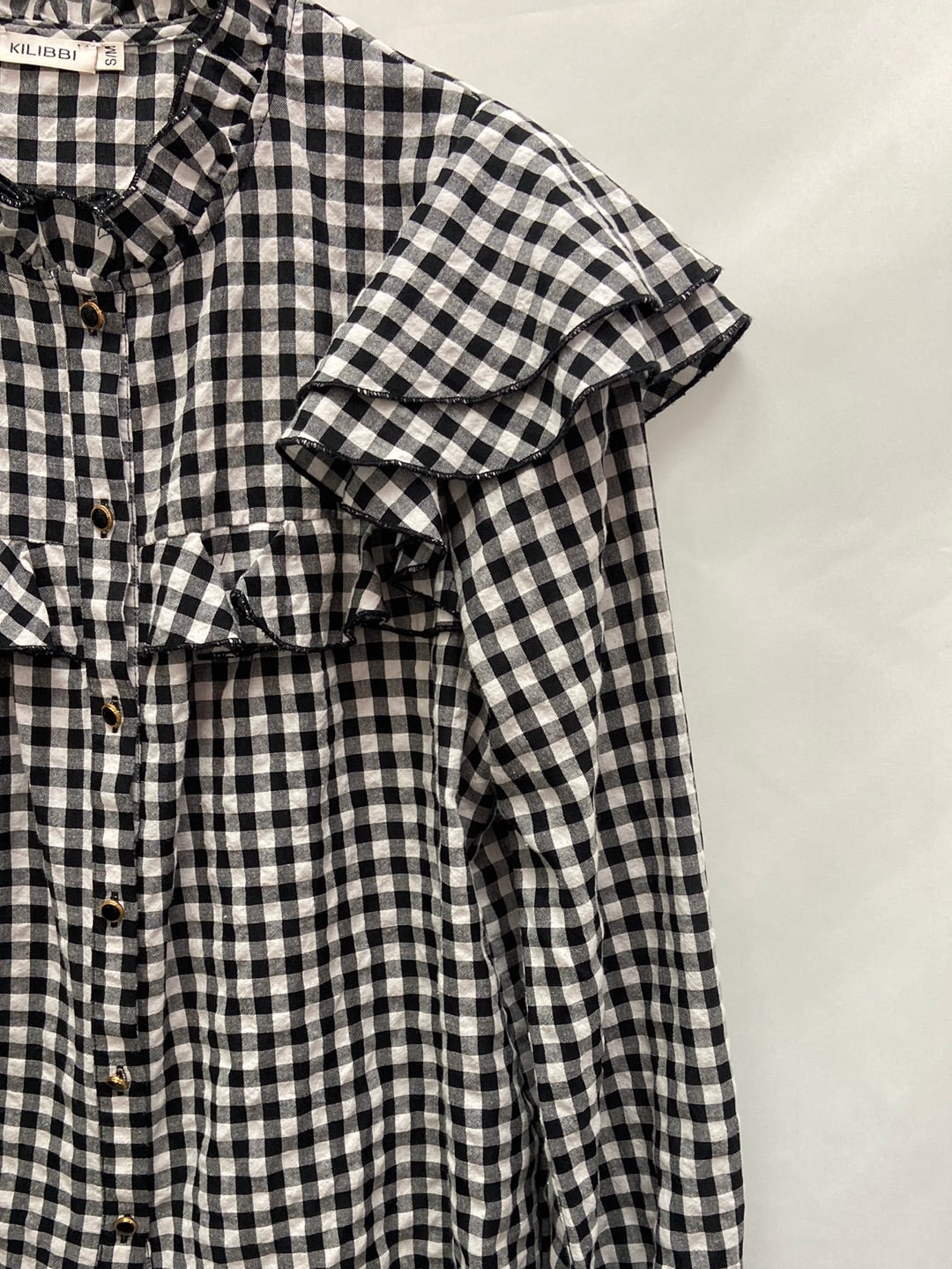 blusa cuadros vichi detalle de volantes y muñecas fruncidas