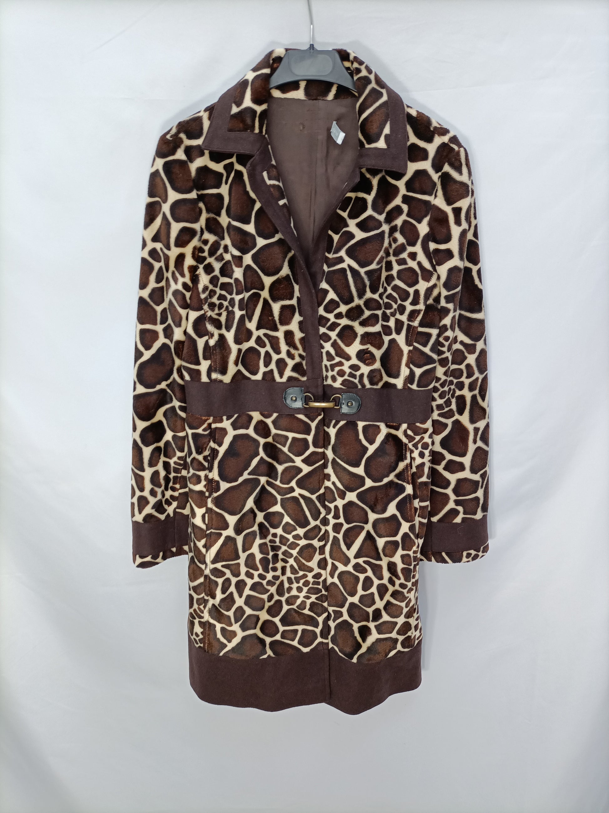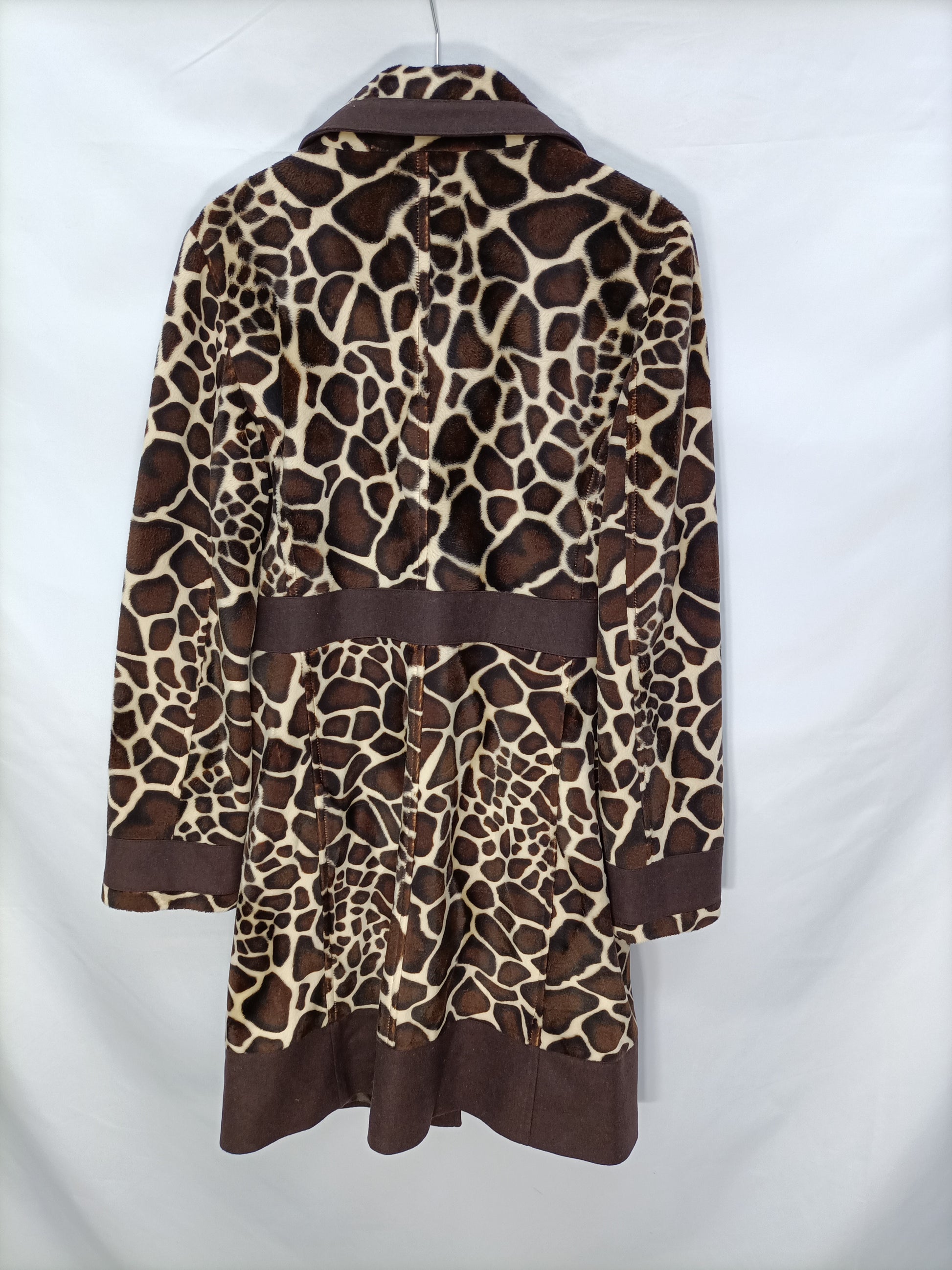 Abrigo finito de pelo con estampado de vaca marrón y beige. Se abrocha con hluna hebilla. Es fluido. No elástico. De sisa a sisa 45 cm largo 94 cm