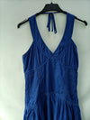 Vestido largo azul con vuelo. Espalda elástica y tirantes ajustables. Largo 136 cm