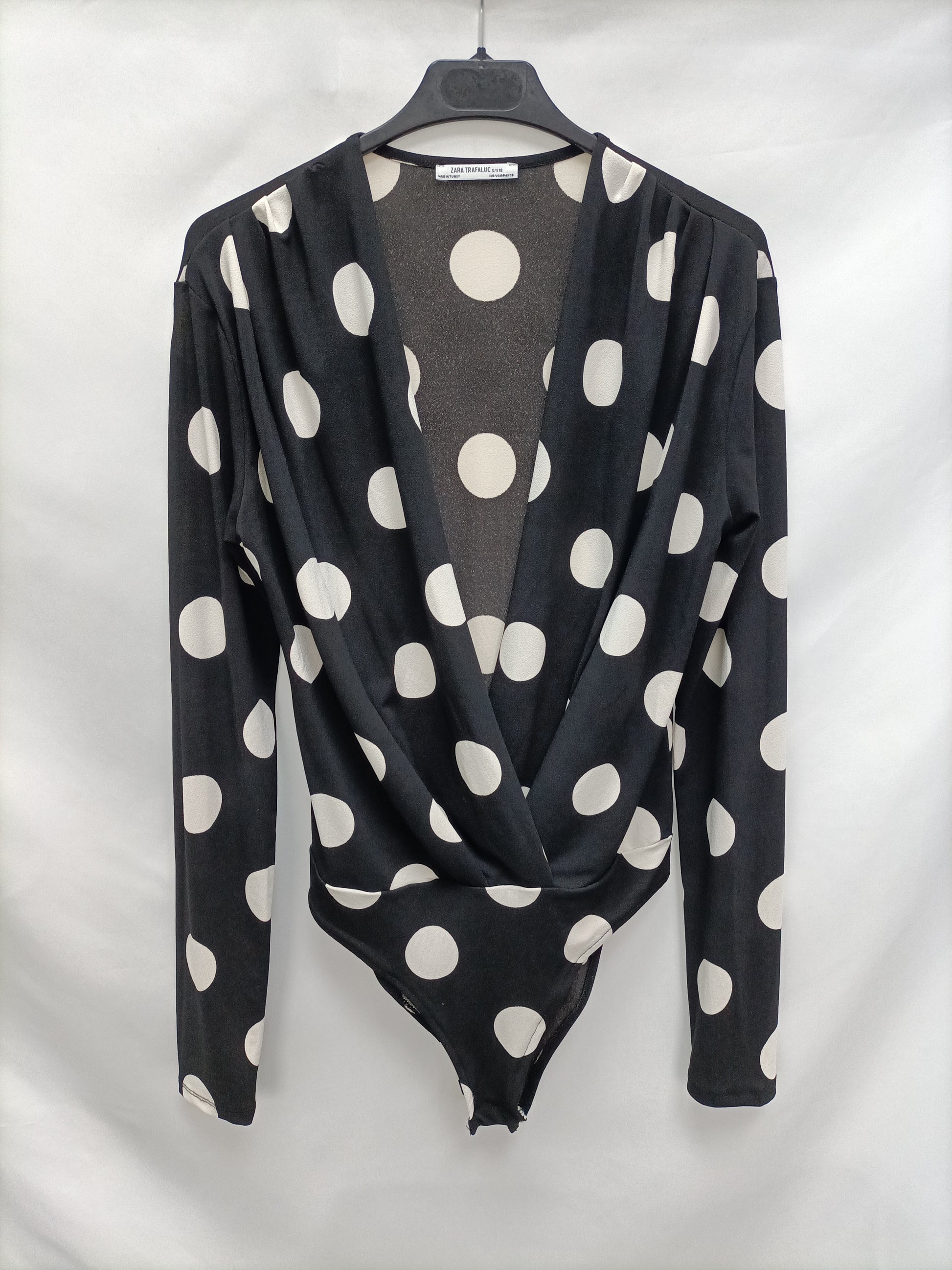 Body negro con luanares blancos. Elastico. Con escote pronunciado. largo 75 cm.