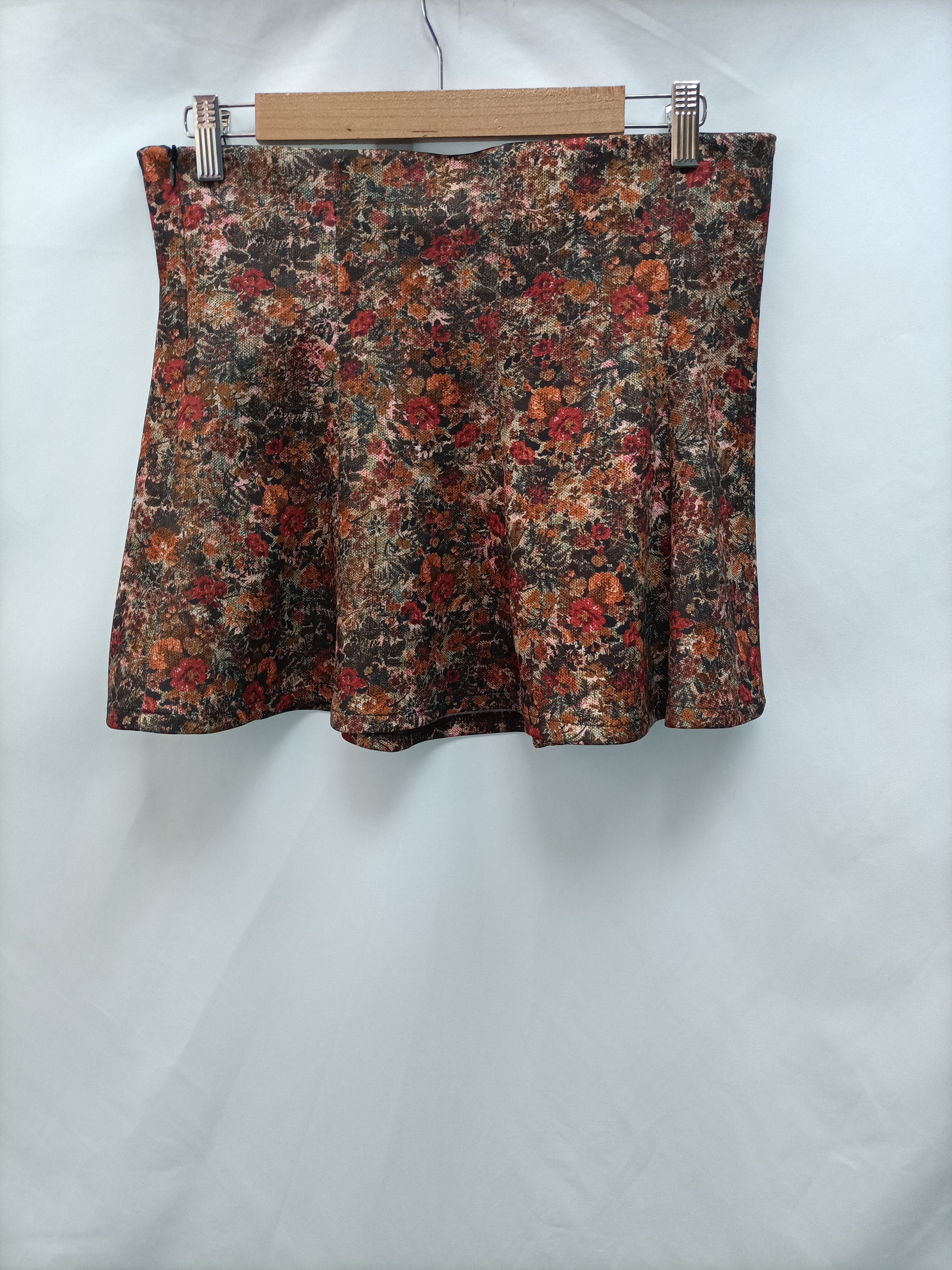 Falda corta con estampado de flores marrones. Elastica de tejido de neopreno. Cintura 40 cm largo 38 cm