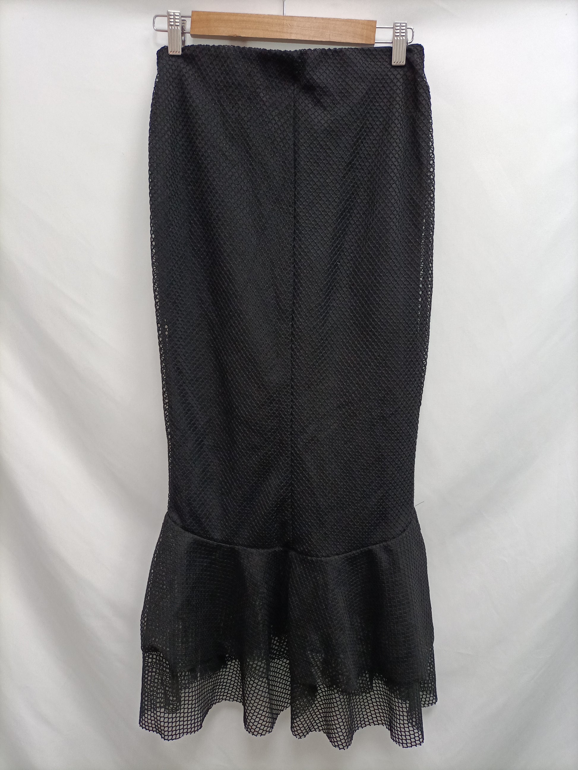 falda midi de rejilla negra con volante en la parte de abajo. Elastica. Largo 93 cm