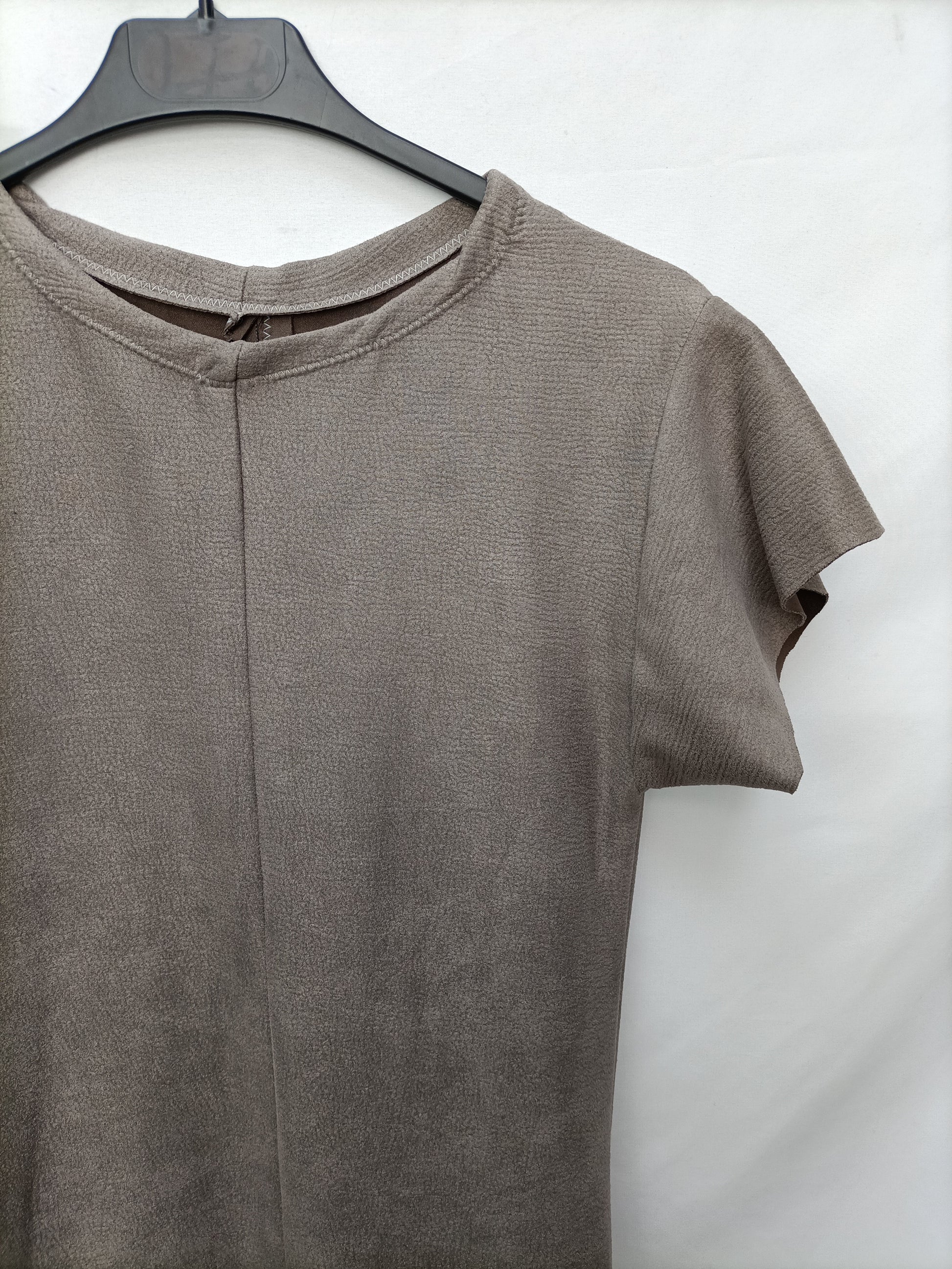 Vestido midi marrón de tejido estilo neopreno finito elastico. Largo 117 cm