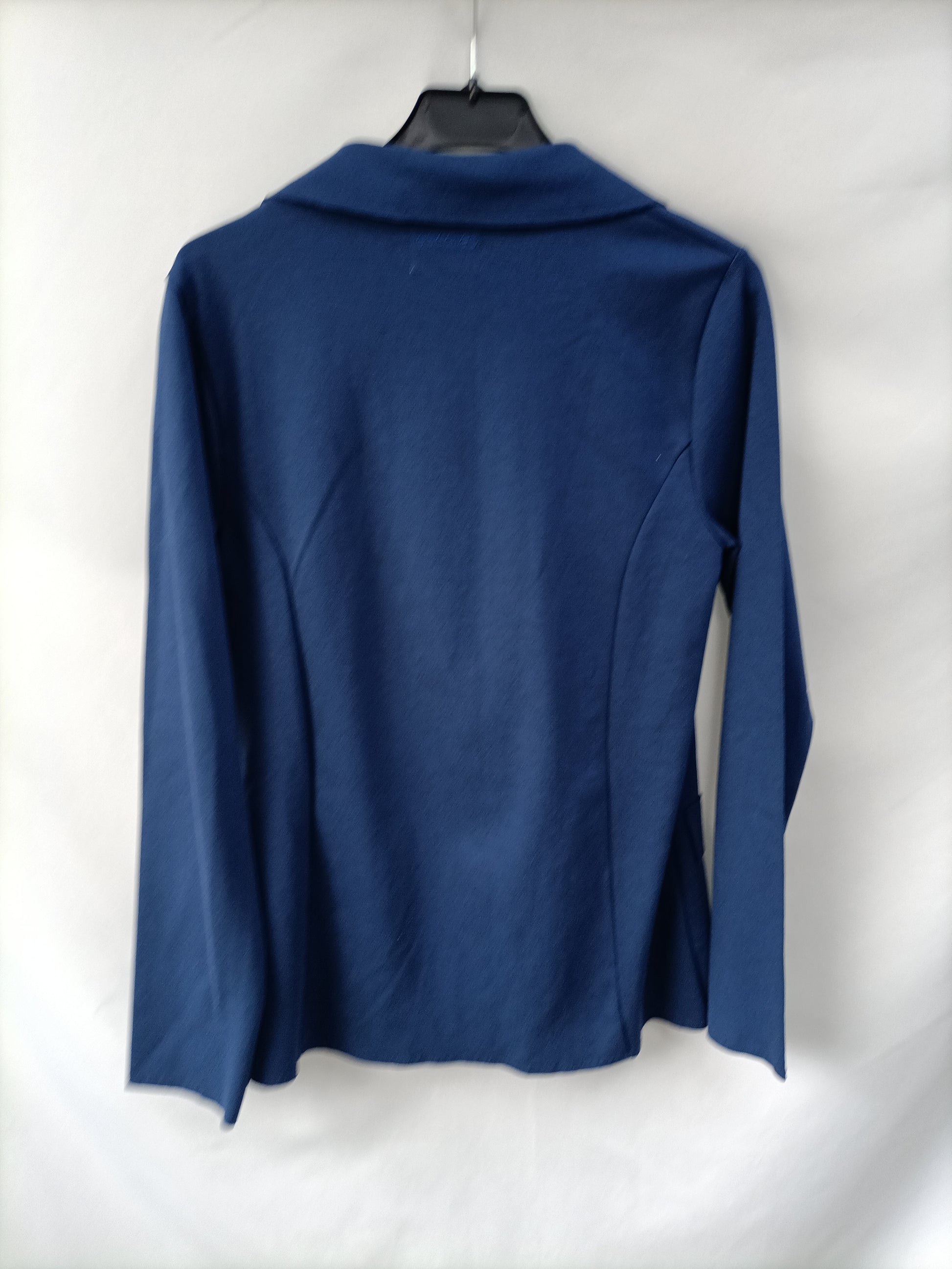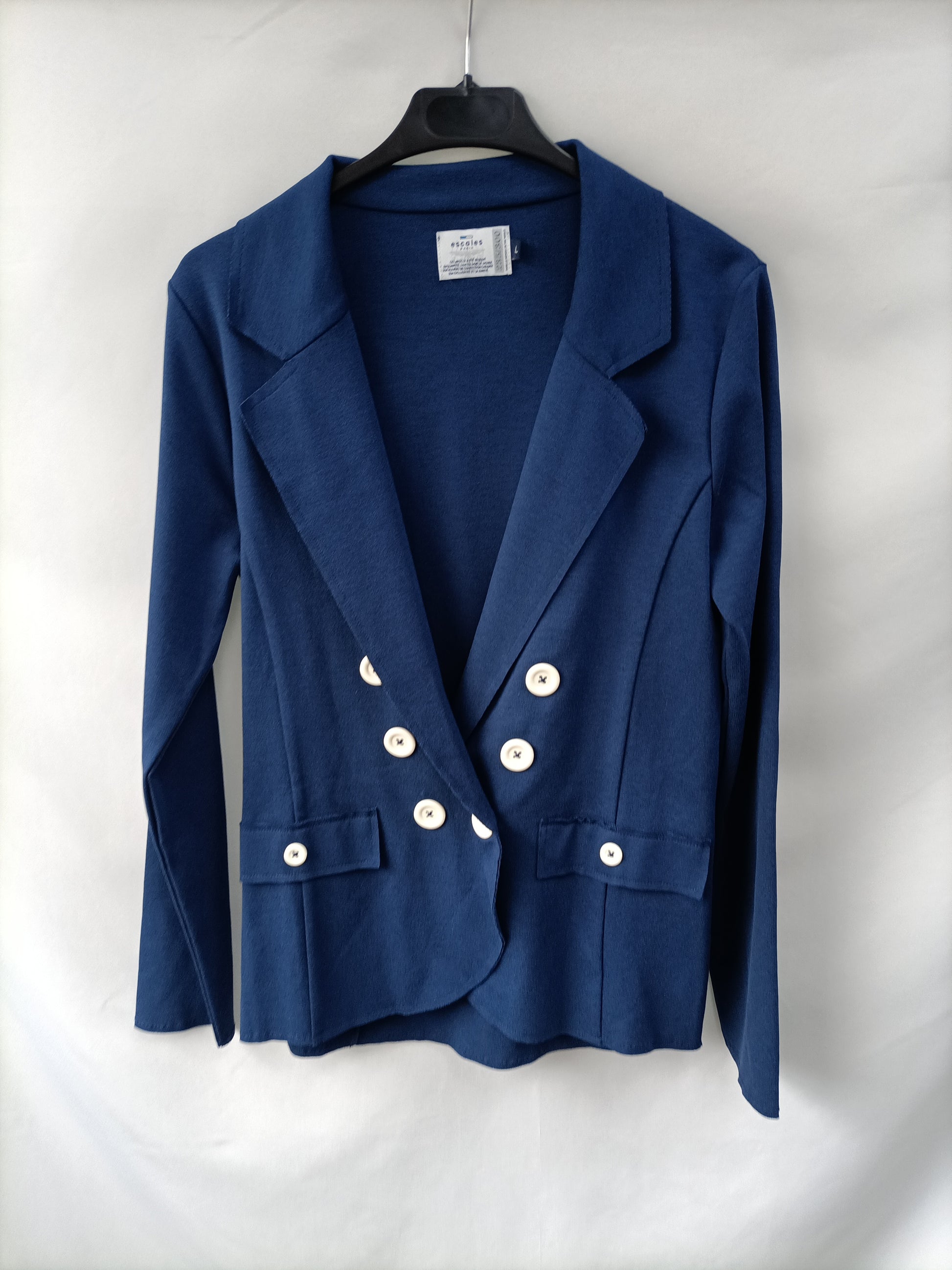 Blazer entallada de tejido elastico. Cruzada con botones blancos. Largo 68 cm
