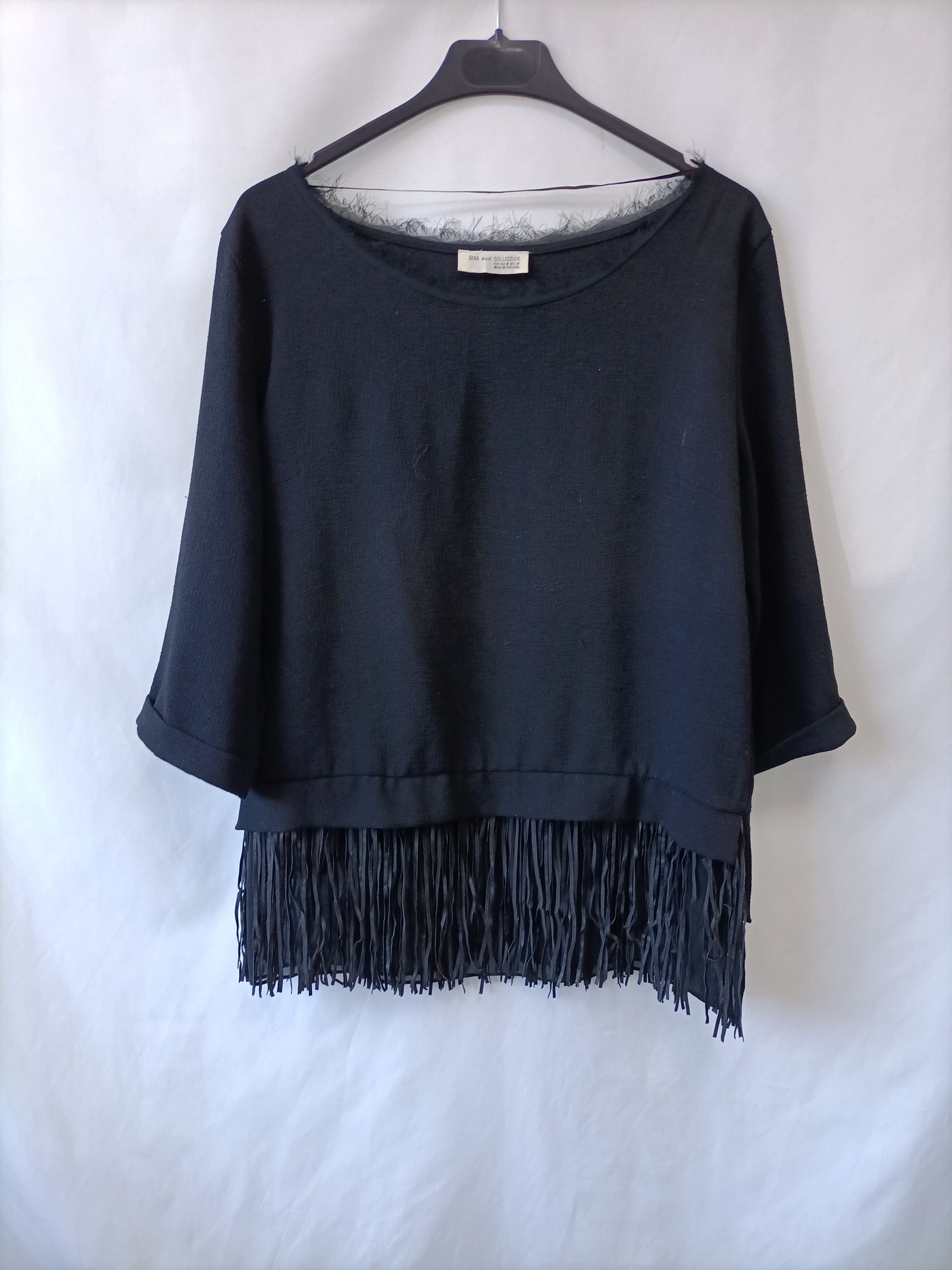 Top negro fluido con flecos de polipiel. No elástico. De sisa a sisa 46 cm cm largo 66 cm
