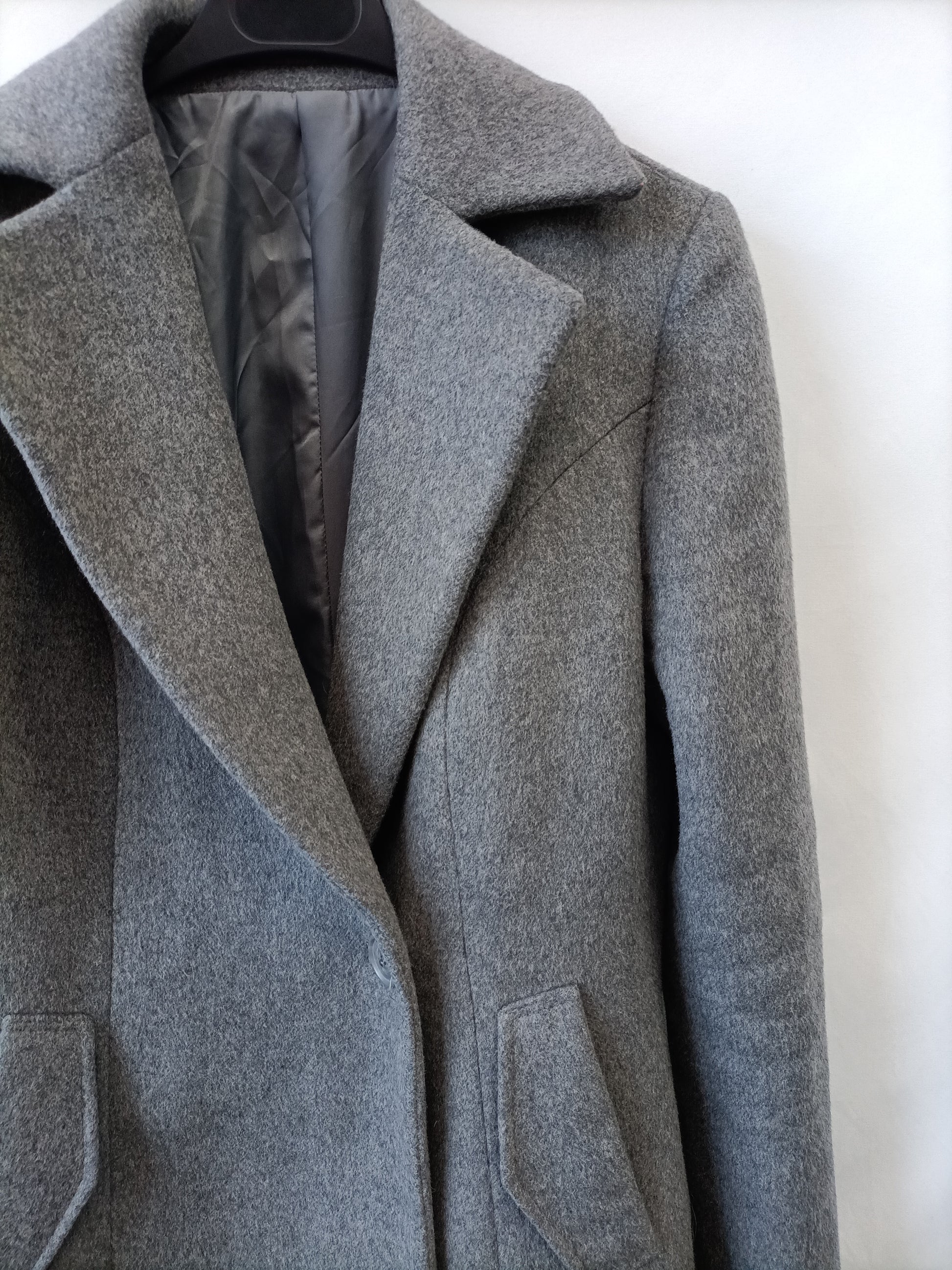 Abrigo gris de paño. No elástico. De sisa a sisa 46 cm largo 99 cm (falta en botón interior)