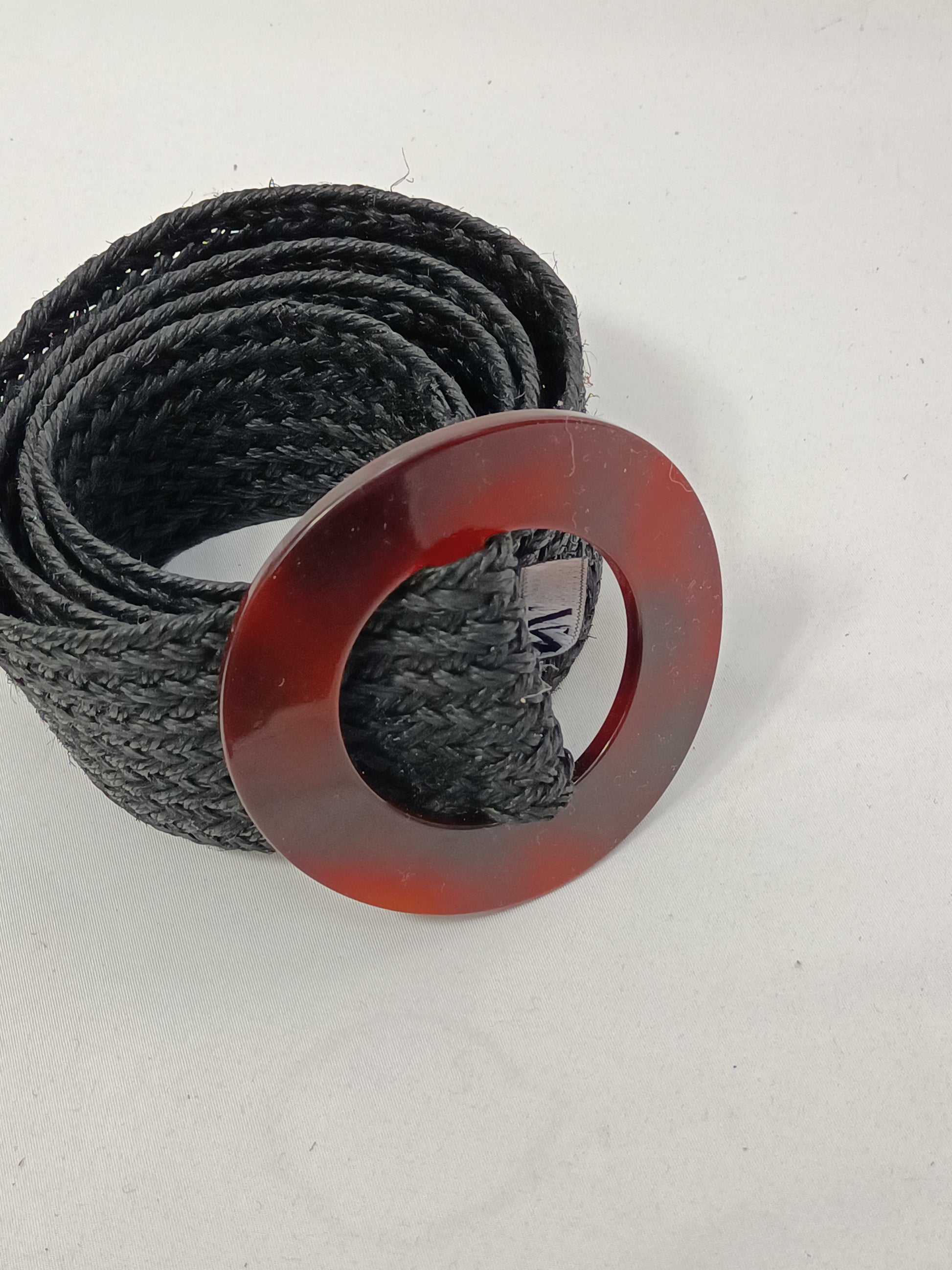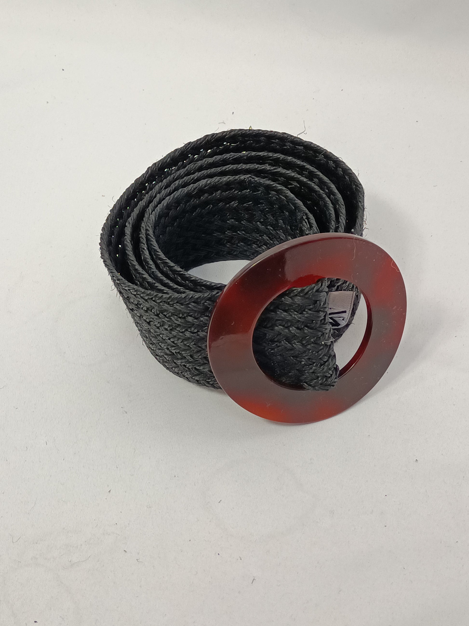 Cinturón negro trenzado de rafia con hebilla de nácar. Ajustable. Largo 104 cm