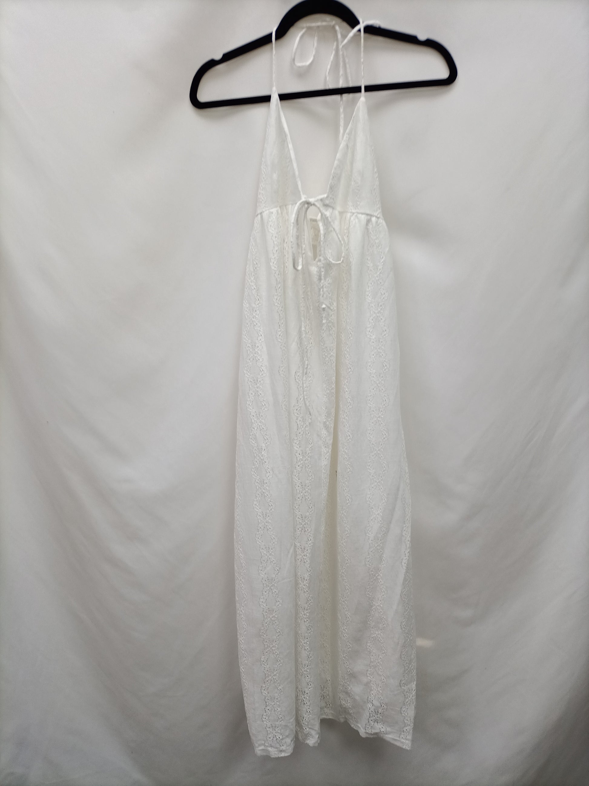 Zara, vestido blanco escote triángulo. De sisa a sisa elástica largo 120 cm