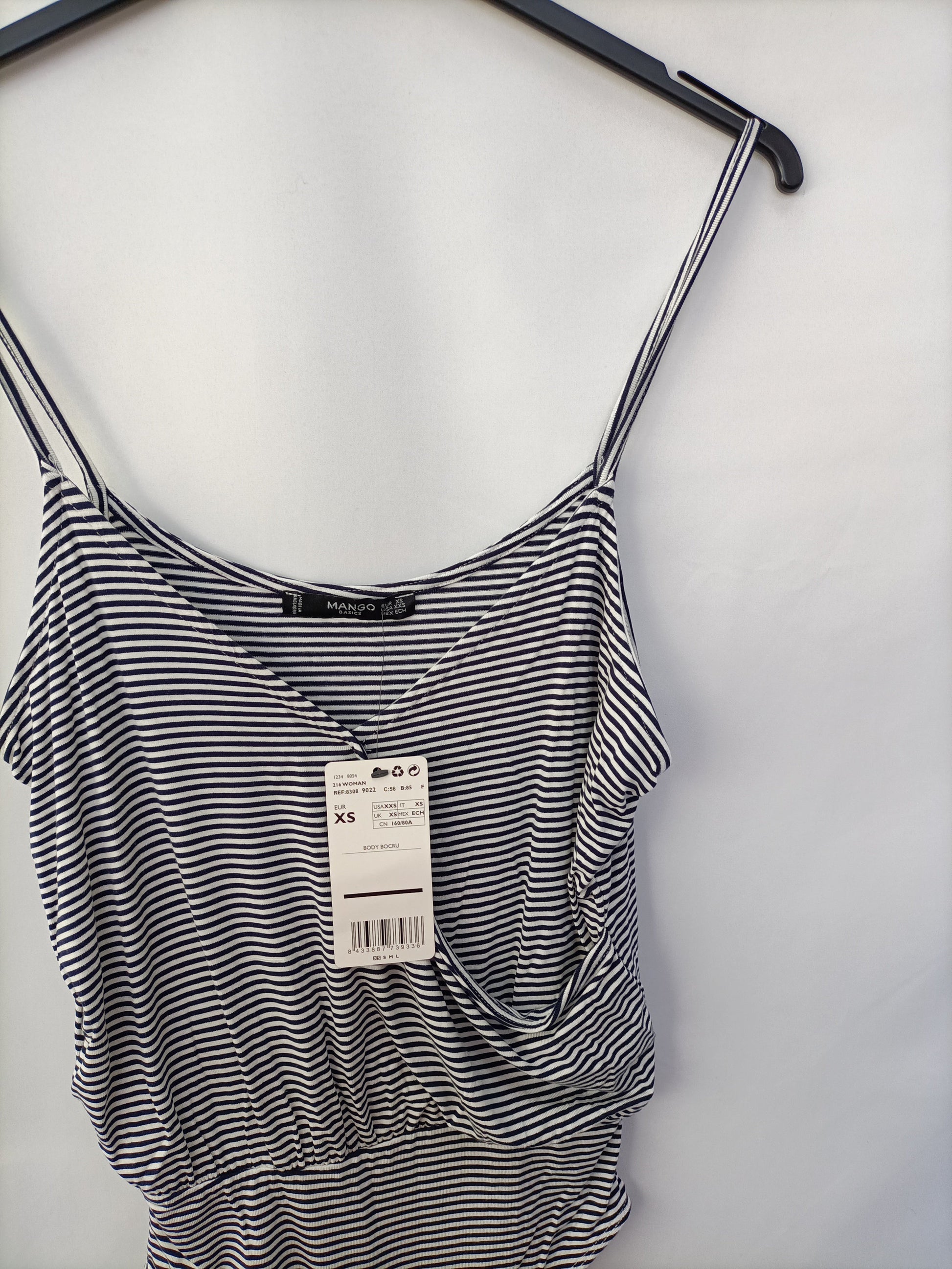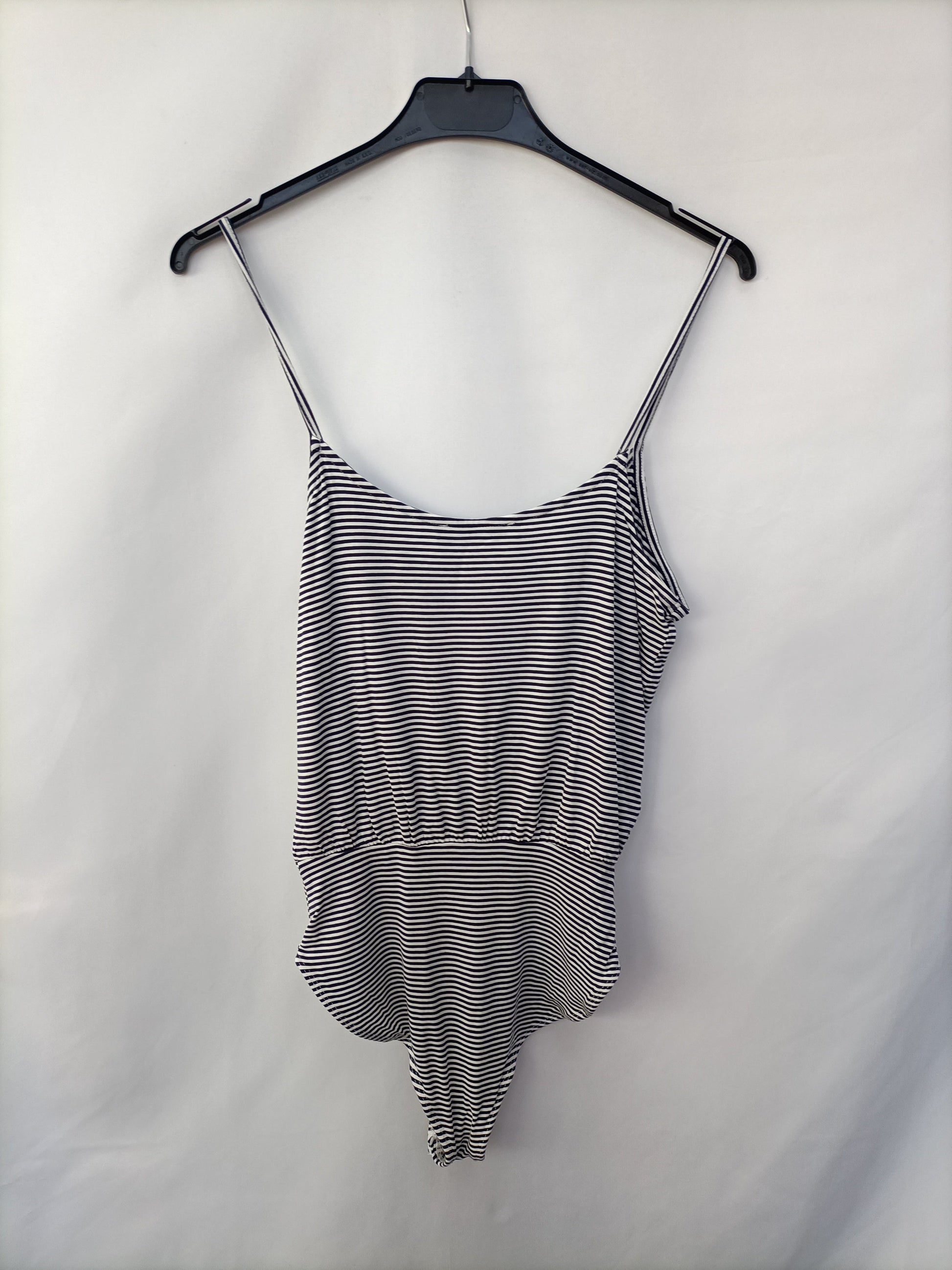 NUEVO CON ETIQUETA. Body de rayas azul y blanco cruzado de tejido tipo camiseta. Elástico. Largo 73 cm
